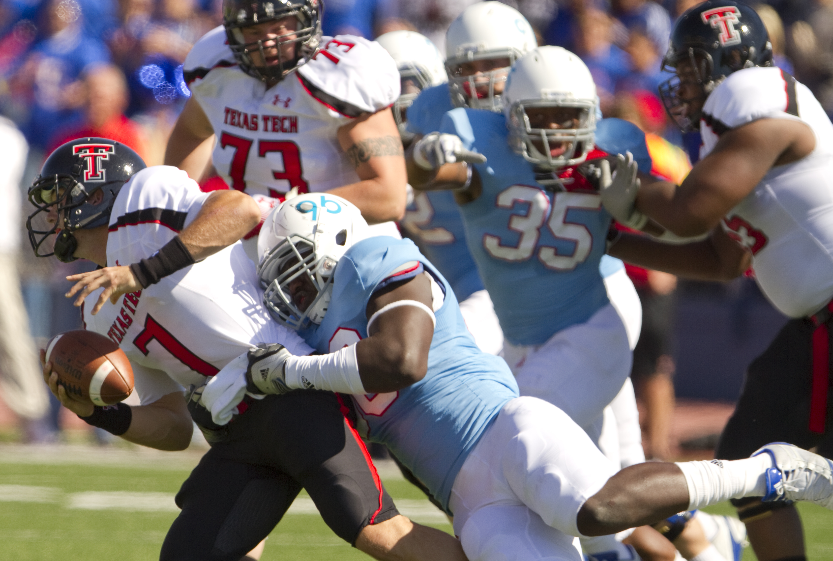 Kansas defensive end Keba Agostinho sacks Texas Tech quarterback Seth Doege during the first quarter on Saturday, Oct. 1, 2011 at Kivisto Field.
