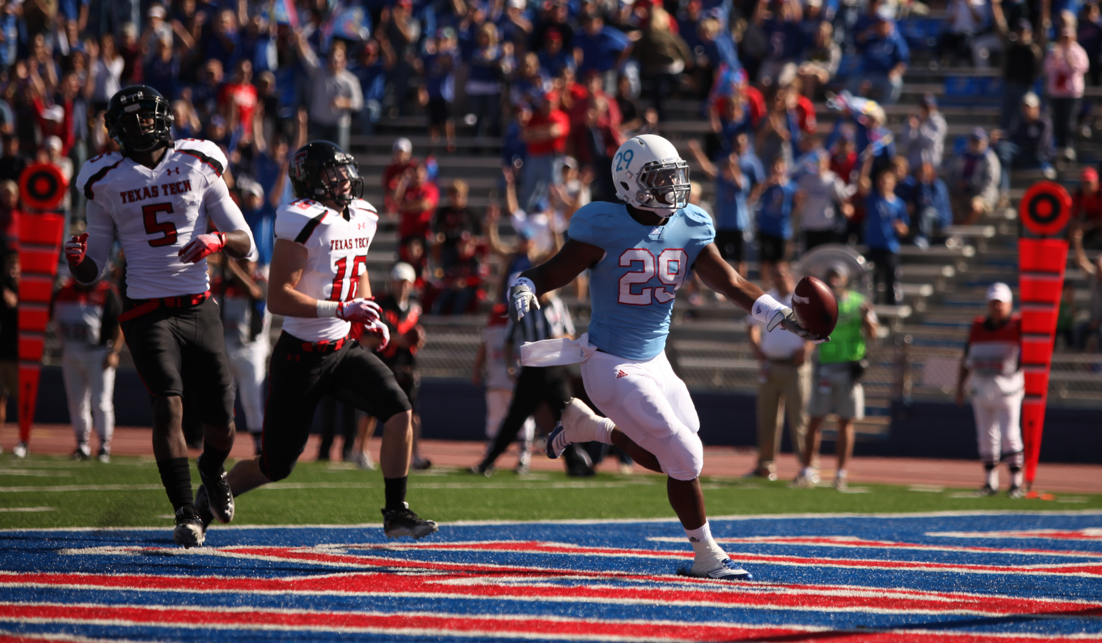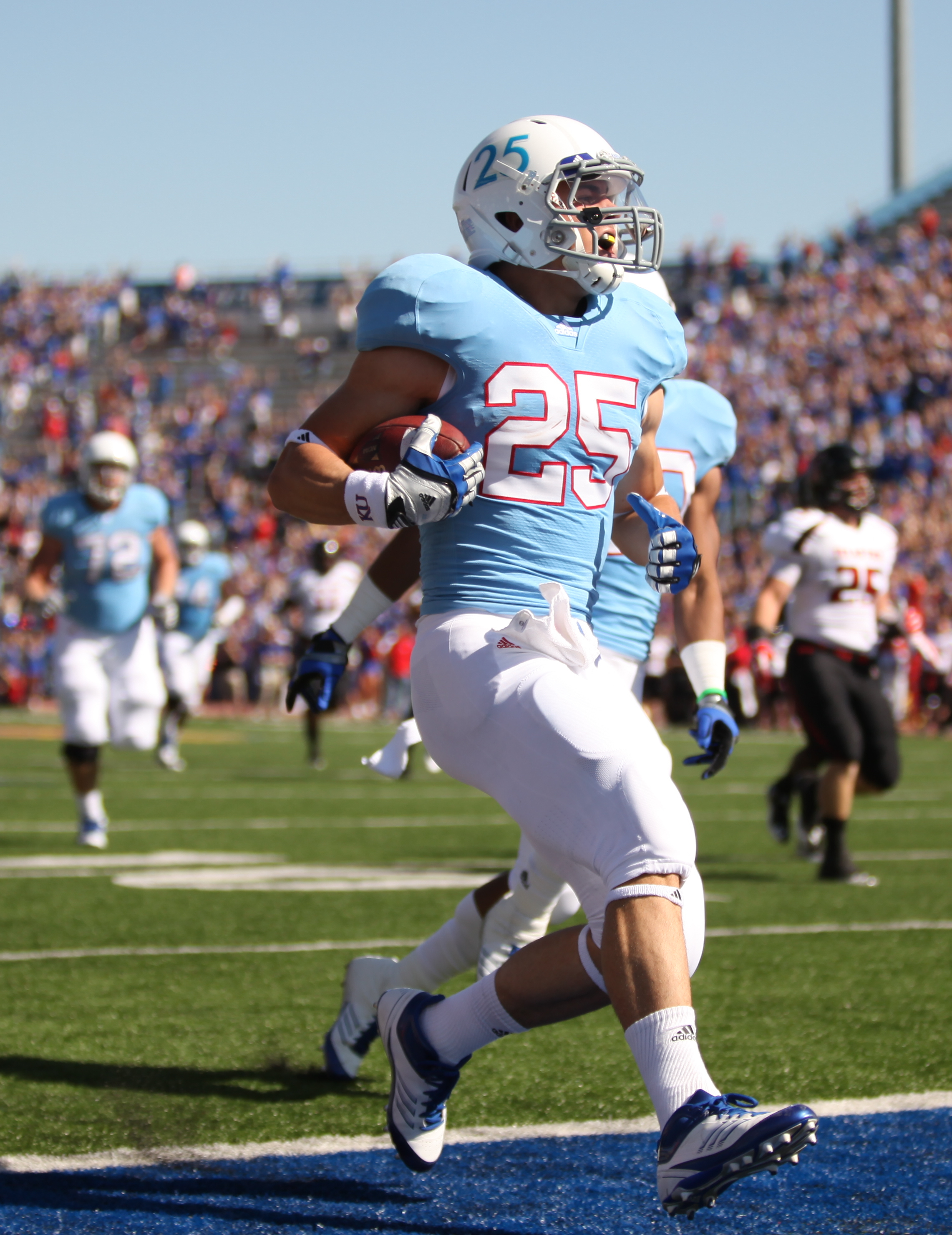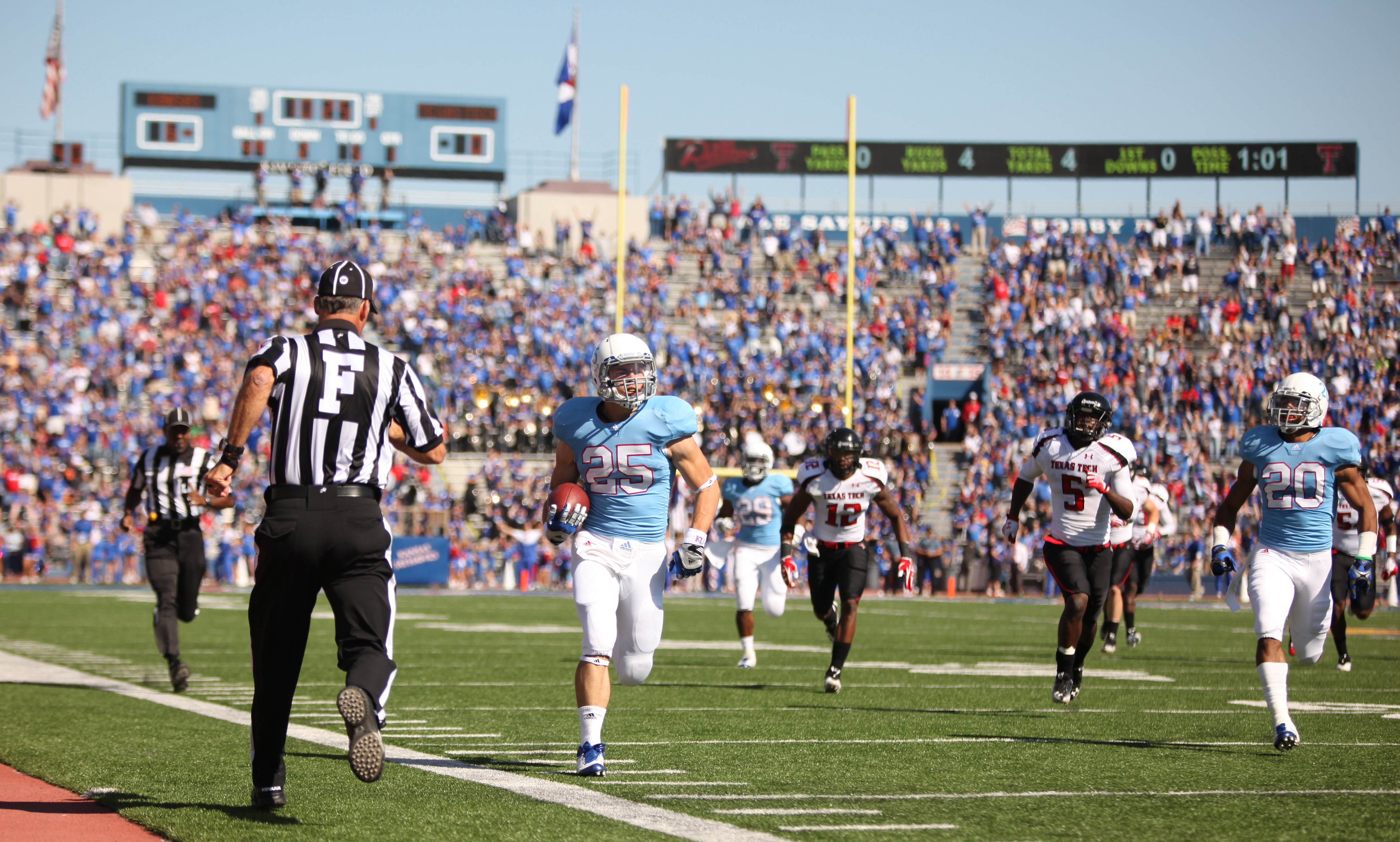 Kansas running back Brandon Bourbon races up the sideline to the end zone as the Texas Tech defense trails during the first quarter on Saturday, Oct. 1, 2011 at Kivisto Field.