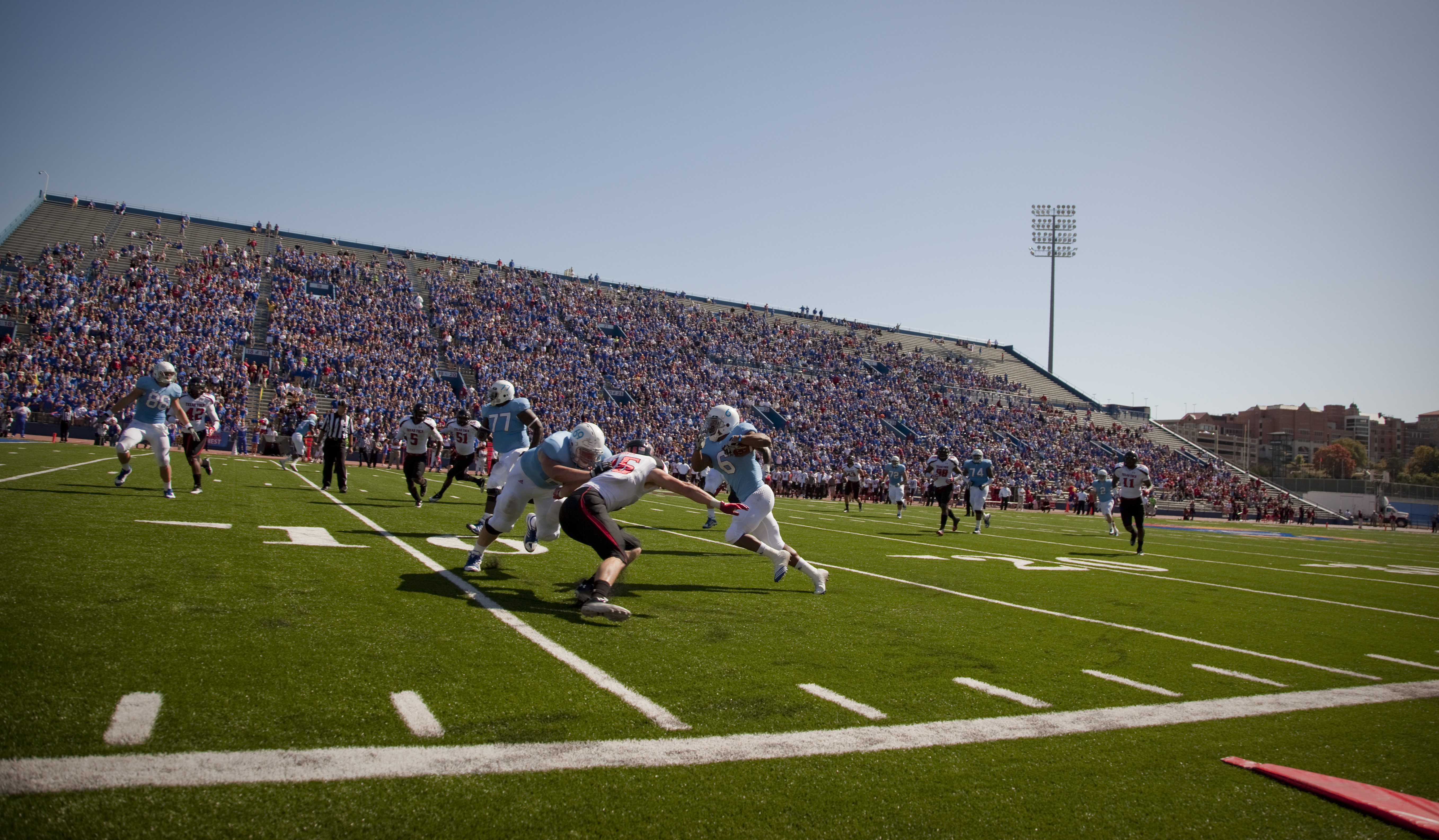 Texas Tech defensive end Leon Mackey runs down Kansas quarterback Jordan Webb for a sack during the first quarter on Saturday, Oct. 1, 2011 at Kivisto Field.