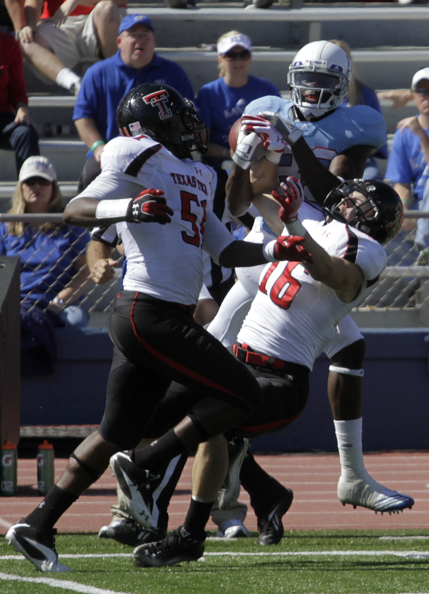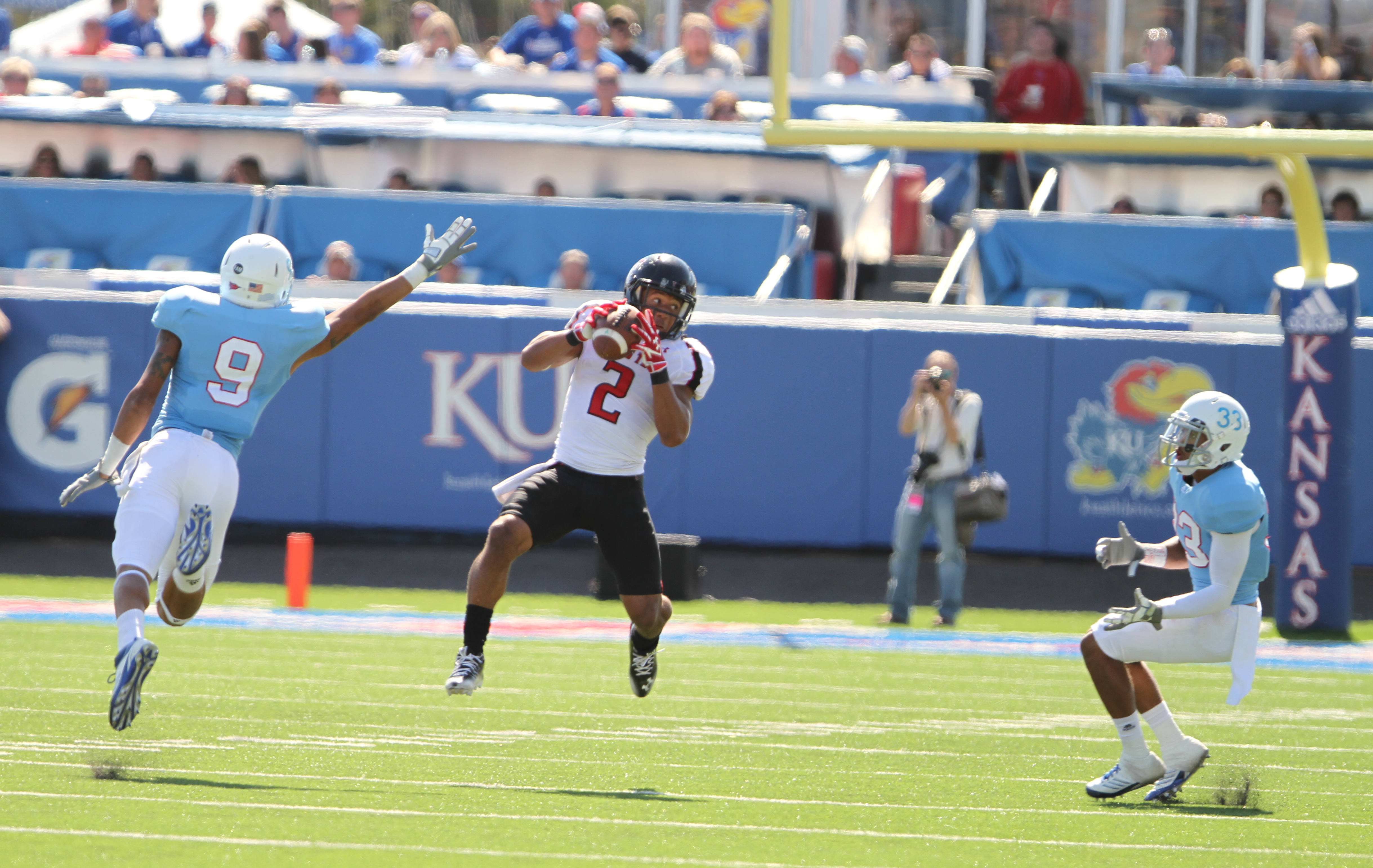 Texas Tech receiver Cornelius Douglas catches a deep pass between Kansas defenders Keeston Terry (9) and Tyler Patmon (33) during the second quarter on Saturday, Oct. 1, 2011 at Kivisto Field.