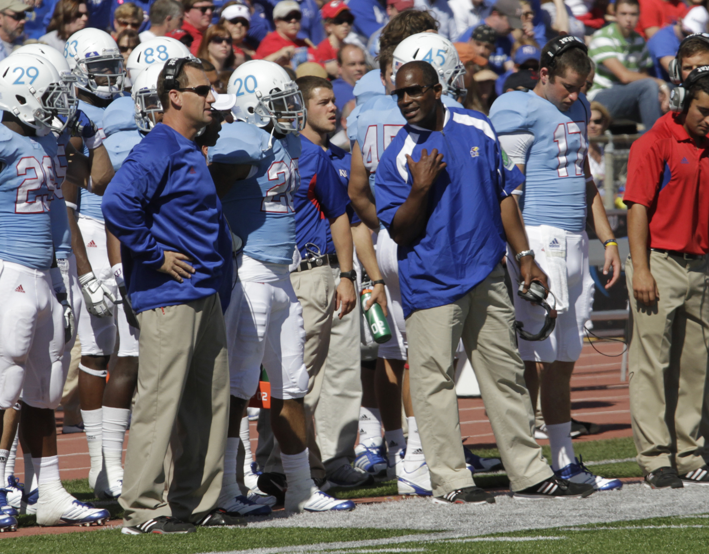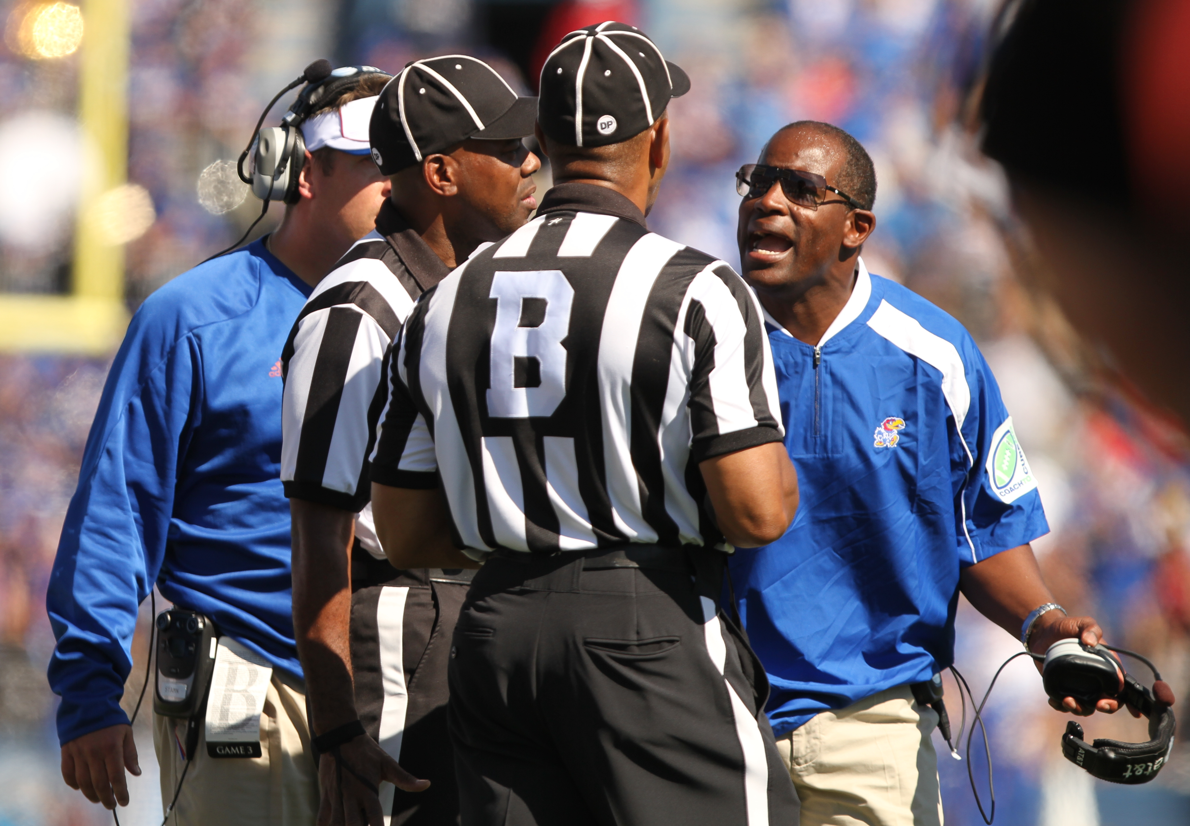 Kansas head coach Turner Gill has words for the officiating crew after a play in which tight end Tim Biere dropped a pass that was recovered for a KU touchdown during the first quarter on Saturday, Oct. 1, 2011 at Kivisto Field.