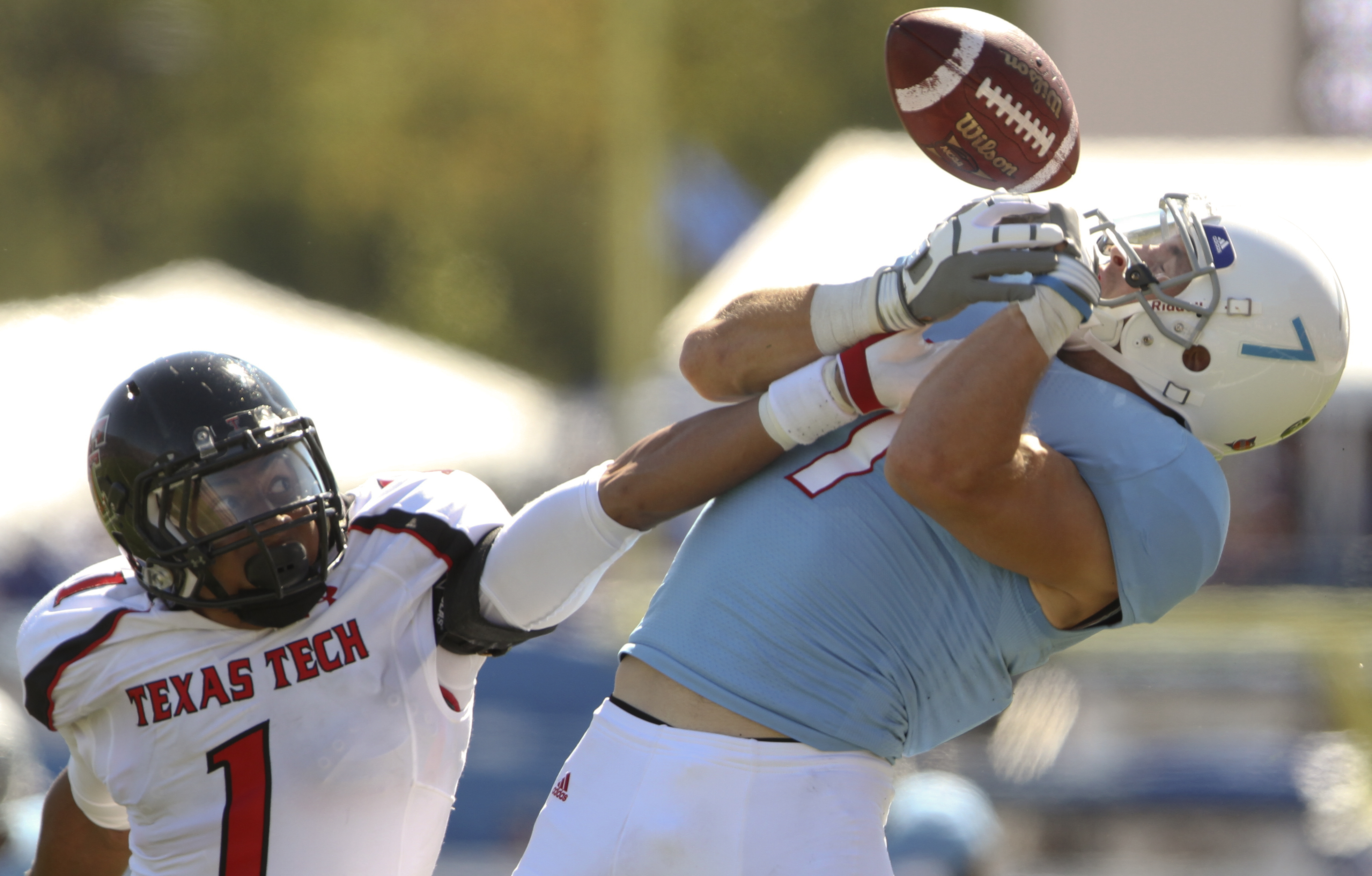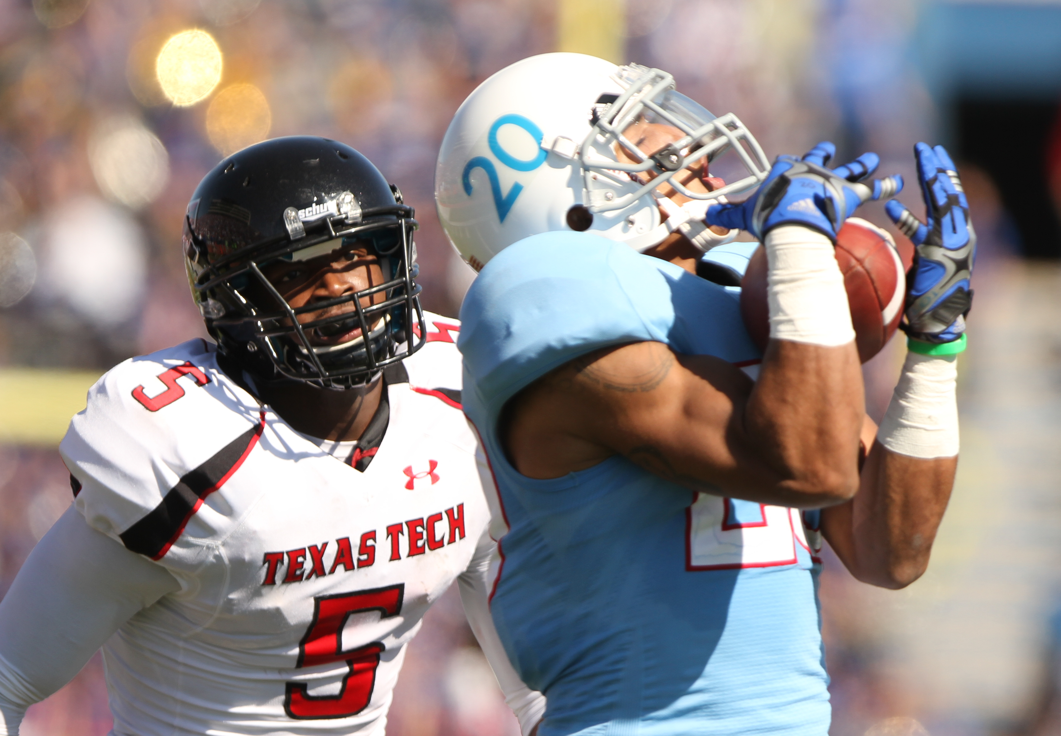 KU's wide receiver Ricki Herod, Jr. (80) and Texas Tech's Cody Davis (16) go up for a pass during the second half Saturday, Oct. 1, 2011, at Memorial Stadium.