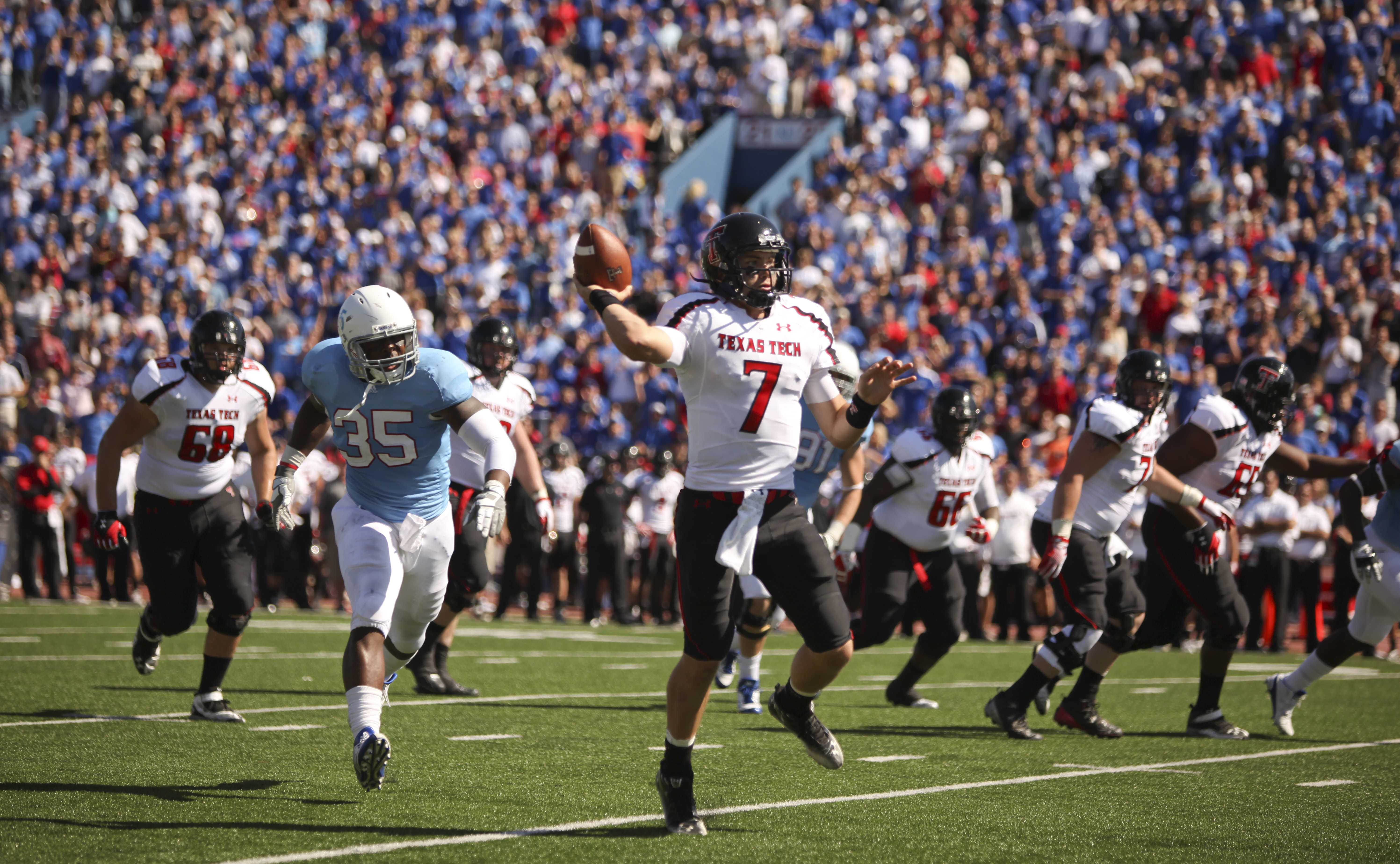 Texas Tech quarterback Seth Doege escapes Kansas defensive end Toben Opurum as he throws for a touchdown during the second quarter on Saturday, Oct. 1, 2011 at Kivisto Field.