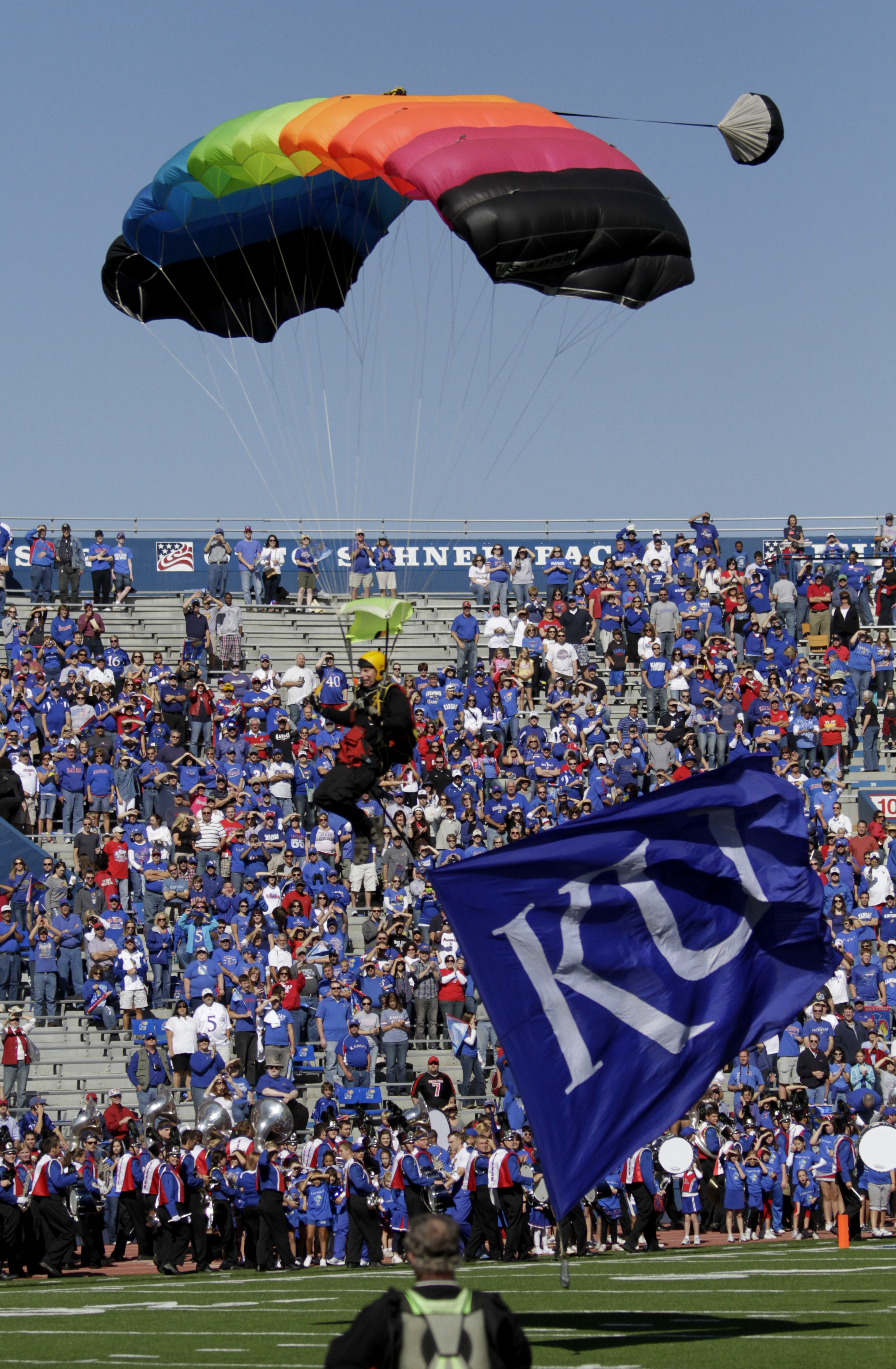 A member of the Falcon Sky Diving team from Kansas City, Mo., drops into the stadium before the start of the Kansas University's game against Texas Tech Saturday, Oct 1, 2011, at Memorial Stadium.
