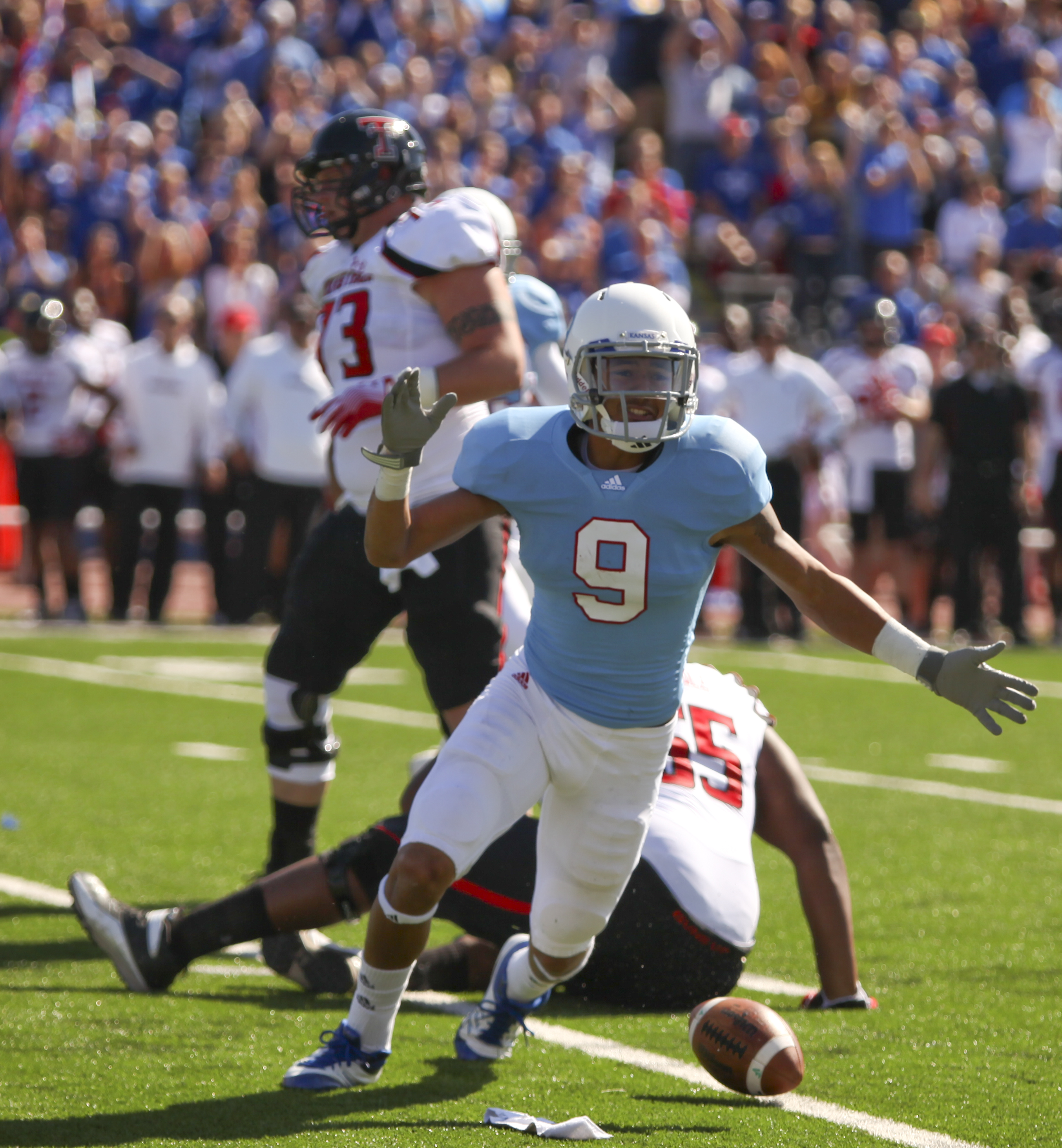 Kansas running back Brandon Bourbon celebrates his touchdown against Texas Tech during the first quarter on Saturday, Oct. 1, 2011 at Kivisto Field.