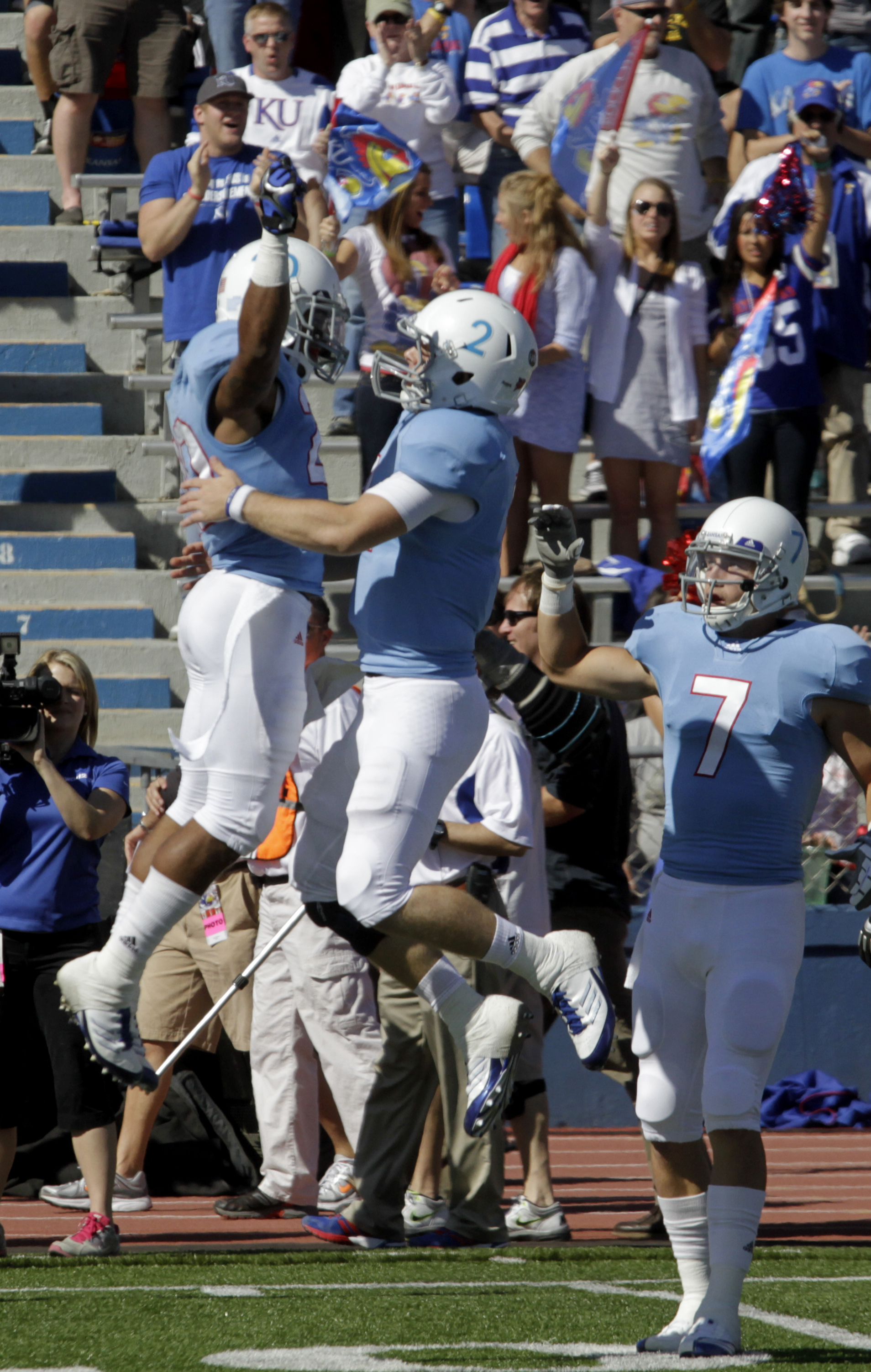 A KU fan celebrates a touchdown by the Jayhawks in the first half of the homecoming game against Texas Tech Saturday, Oct. 1, 2011, at Memorial Stadium.