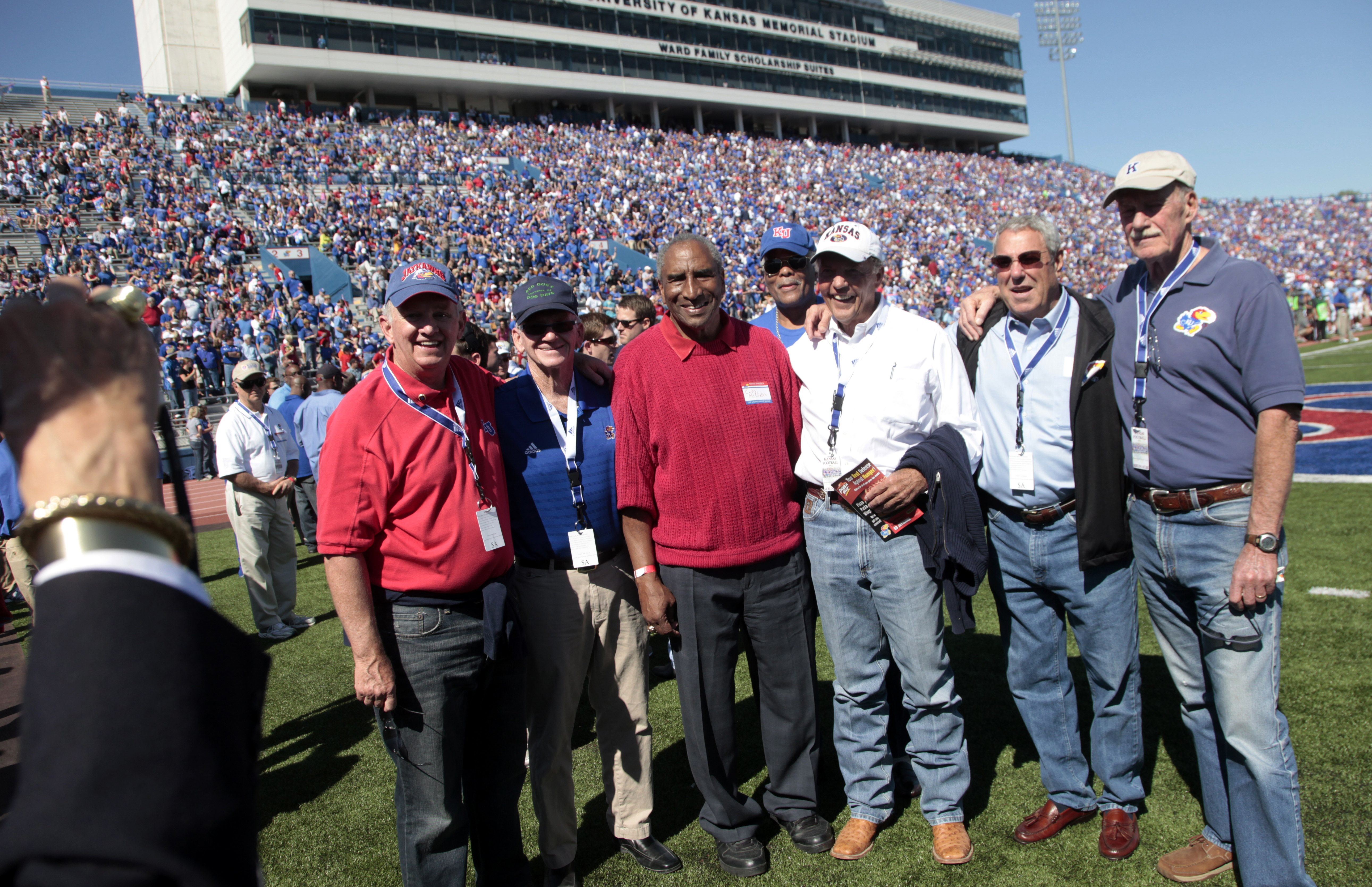 Members of KU's 1961 Blue Bonnet Bowl team gather for a photo after a introduction during a break in the first half of the Jayhawks' game against Texas Tech on Saturday, Oct. 1, 2011, at Memorial Stadium. From left are Andy Graham, trainer Don Gardner, Curtis McClinton, Jesse Newman, Mike Deer, Willis Brooks and Stan Kirshman.