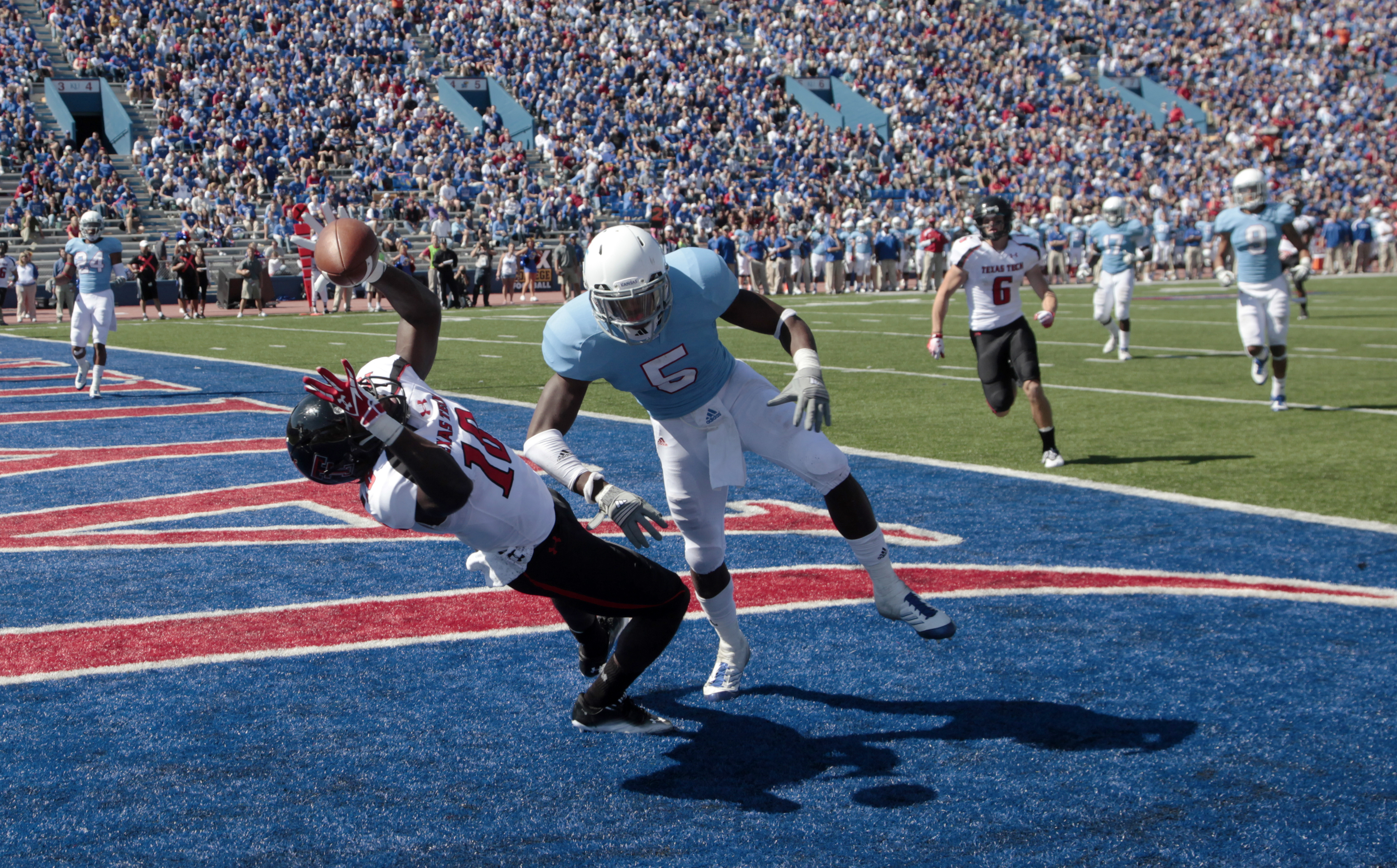 Texas Tech's Eric Ward grabs a touchdown catch over Kansas defender Greg Brown during the second half Saturday, Oct 1, 2011, at Memorial Stadium.