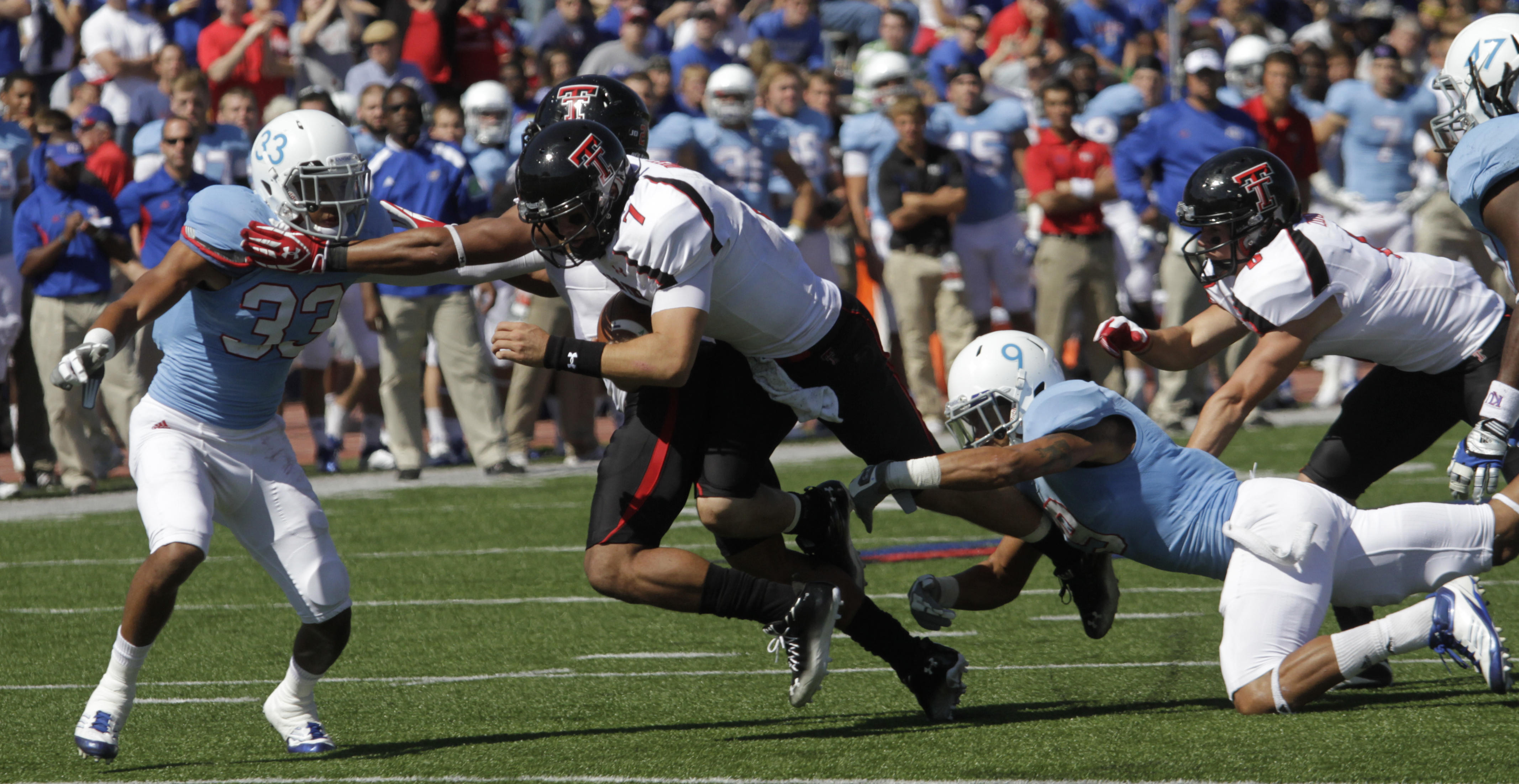 Texas Tech quarterback Seth Doege (7) scrambles for yardage as KU defenders Tyler Patmon (33) right and Keeston Terry (9) pursue during the second half Saturday, Oct. 1, 2011, at Memorial Stadium.