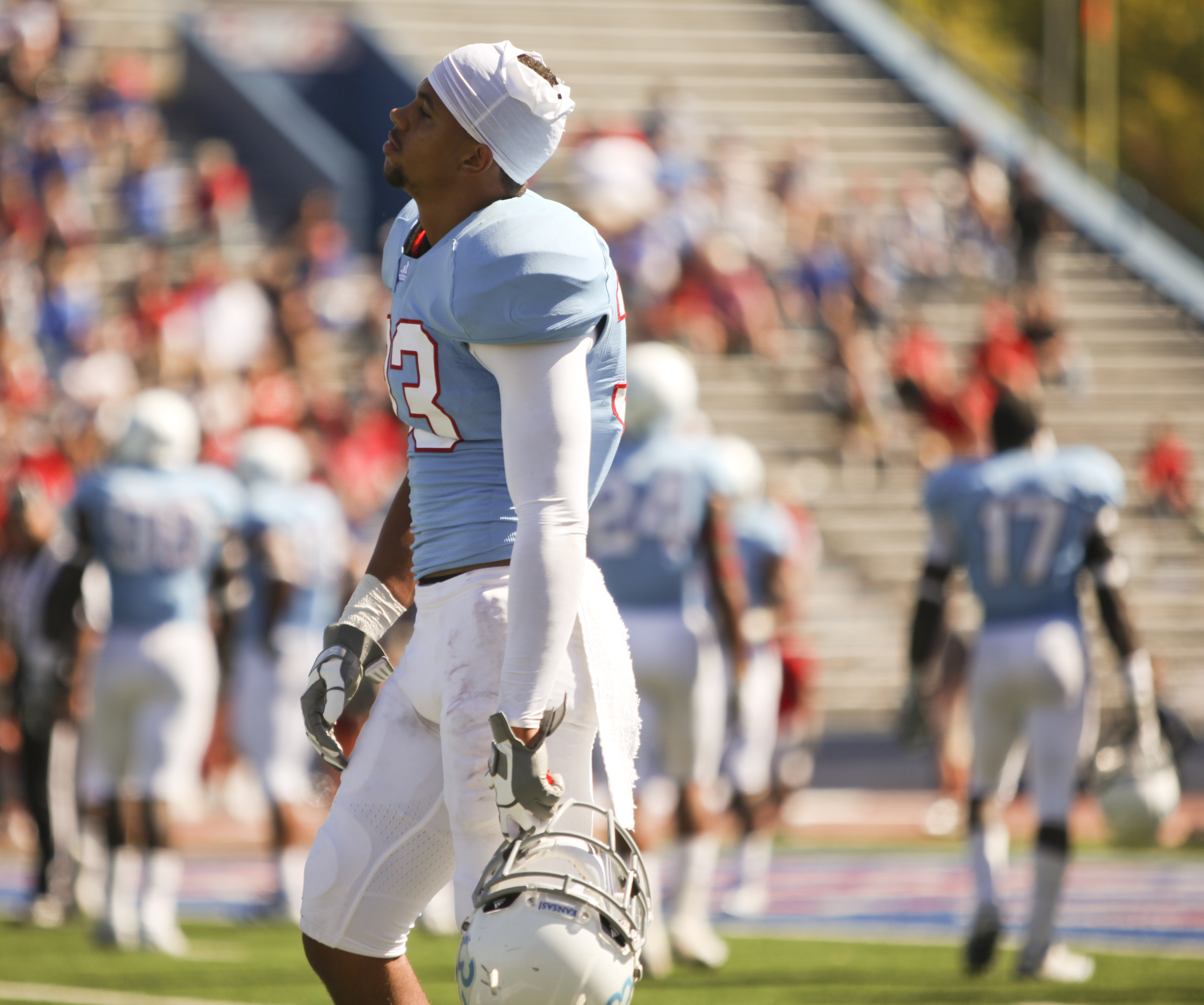 Kansas cornerback Tyler Patmon sighs after a Texas Tech runner was awarded a first down during a goal line stand in the third quarter on Saturday, Oct. 1, 2011 at Kivisto Field.