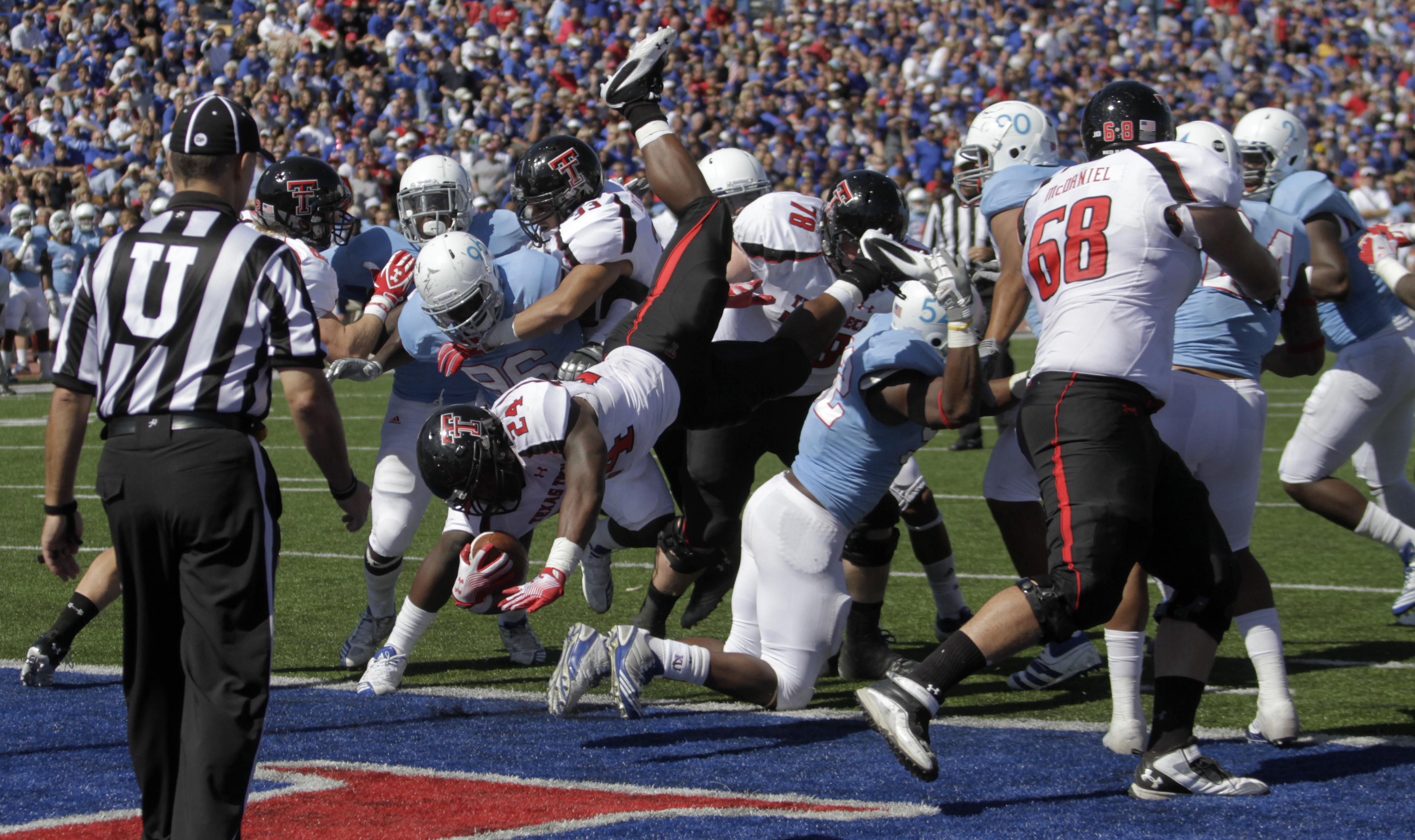 Texas Tech running back Eric Stephens (24) jumps over KU's defensive line for a touchdown during the second half Saturday, Oct. 1, 2011, at Memorial Stadium.