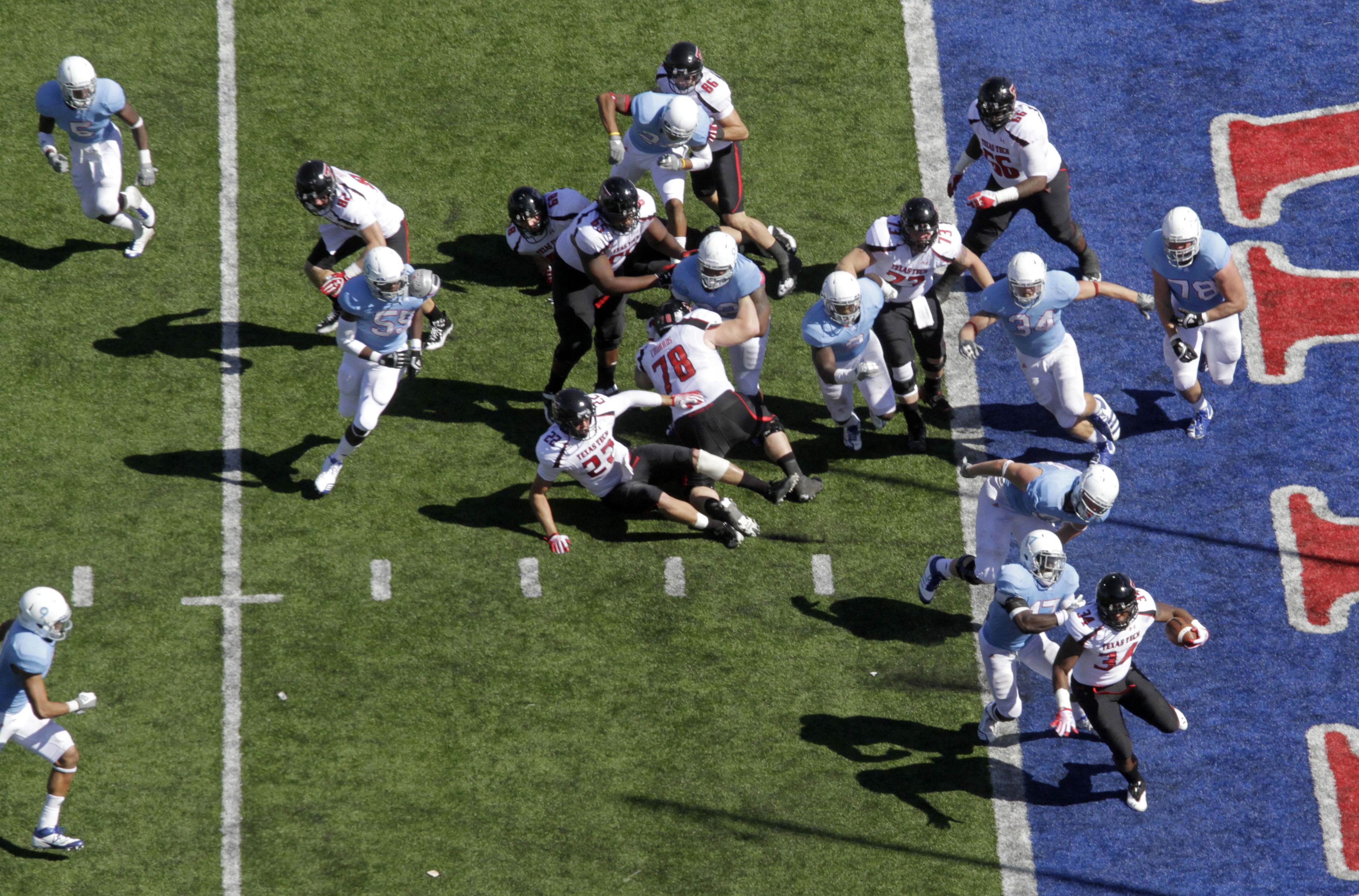 KU defenders chase Texas Tech's Kenny Williams (34) out of the end zone during the second half Saturday, Oct. 1, 2011, at Memorial Stadium.