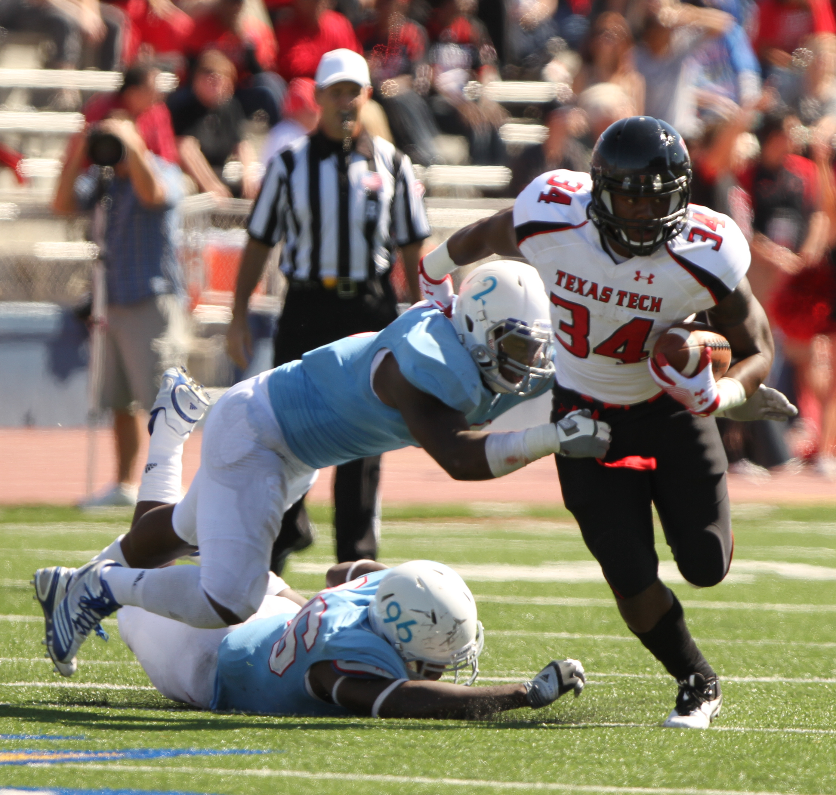 Texas Tech running back Kenny Williams eludes Kansas defenders Darius Willis (2) and Keba Agostinho (96) during the fourth quarter on Saturday, Oct. 1, 2011 at Kivisto Field.