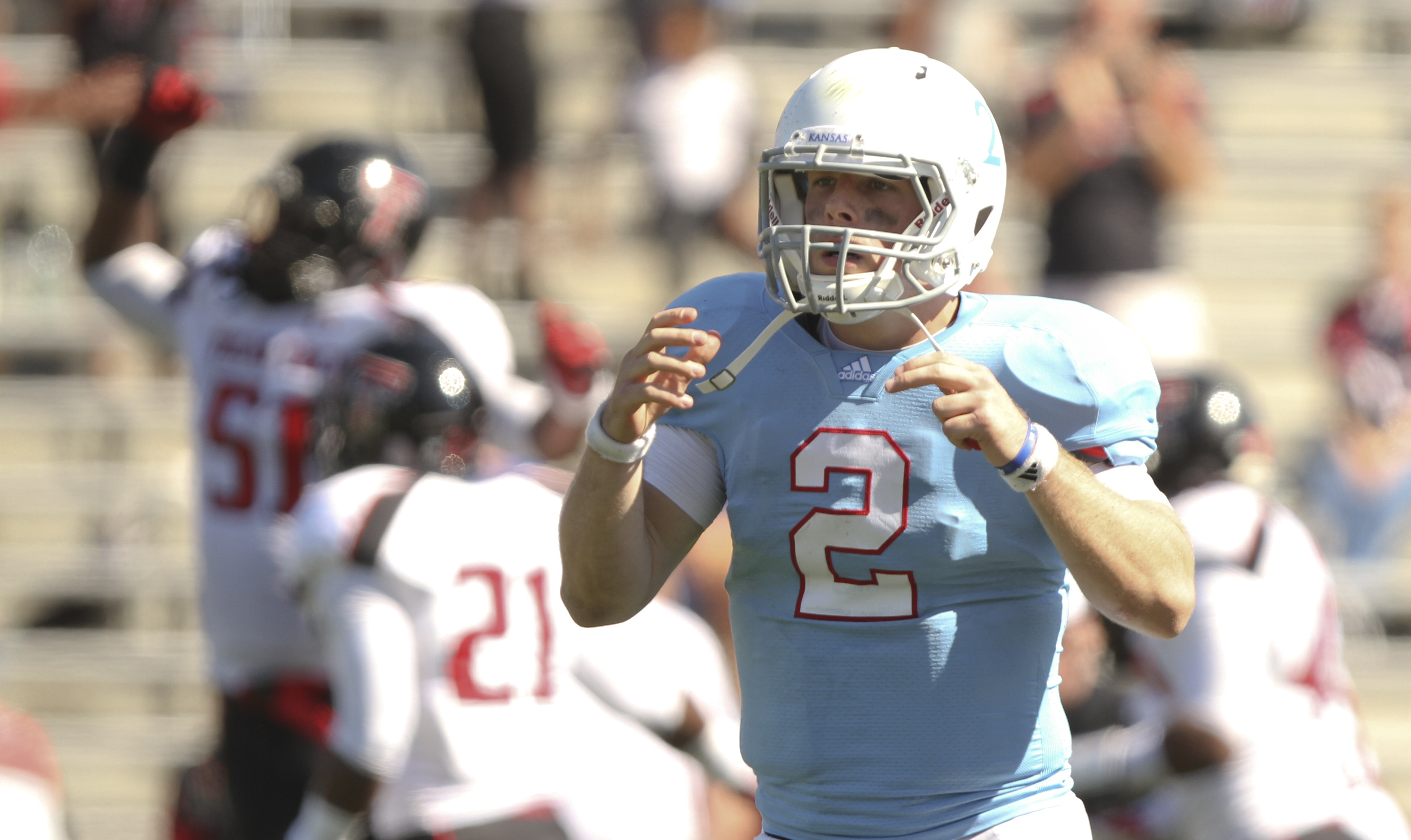 Kansas quarterback Jordan Webb reacts after running back James Sims is stopped short of a first down on a fourth-down run against Texas Tech late in the fourth quarter on Saturday, Oct. 1, 2011 at Kivisto Field.