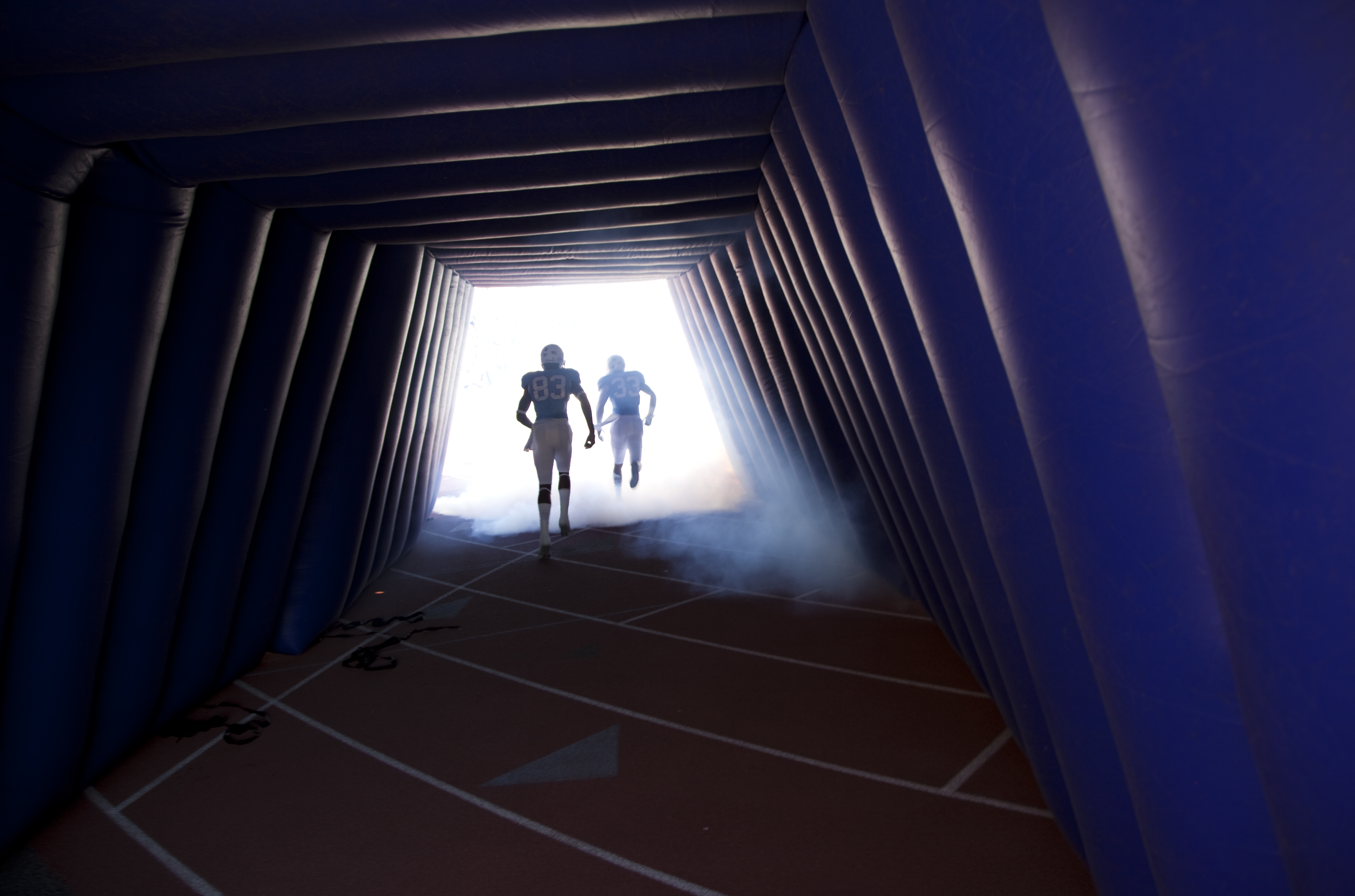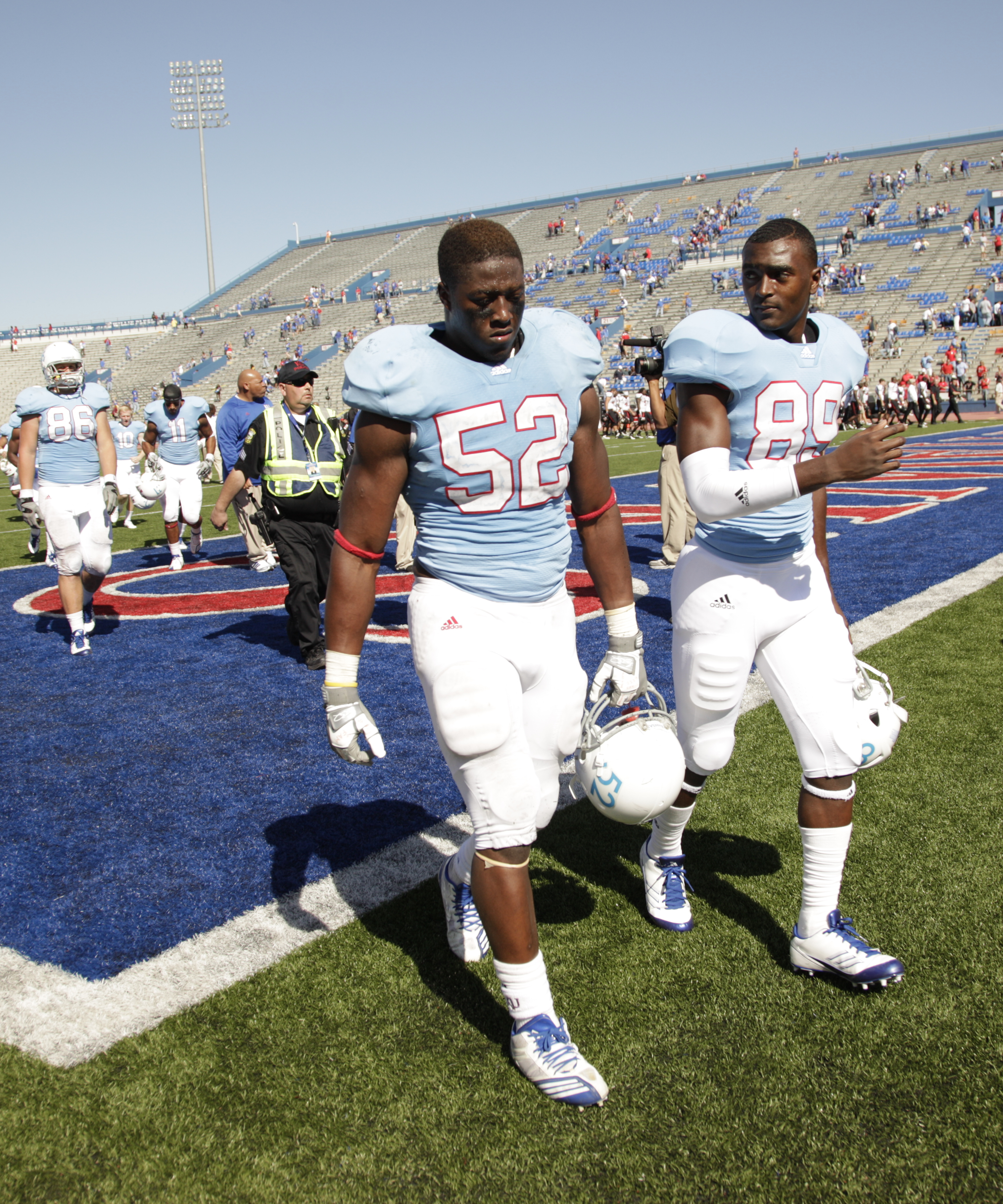 Kansas players Chris Omigie (83) and Tyler Patmon (33) take the field prior to kickoff against Texas Tech on Saturday, Oct. 1, 2011 at Kivisto Field.