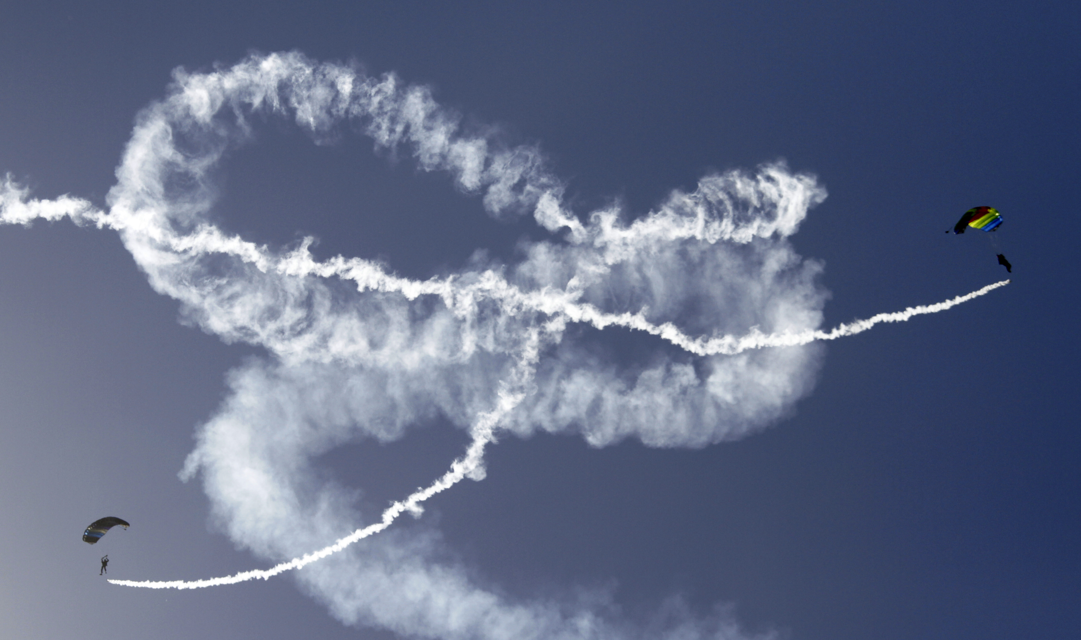 Members of the Falcon Sky Diving team from Kansas City circle above Memorial Stadium before landing in the stadium Saturday, Oct 1, 2011, at Memorial Stadium.