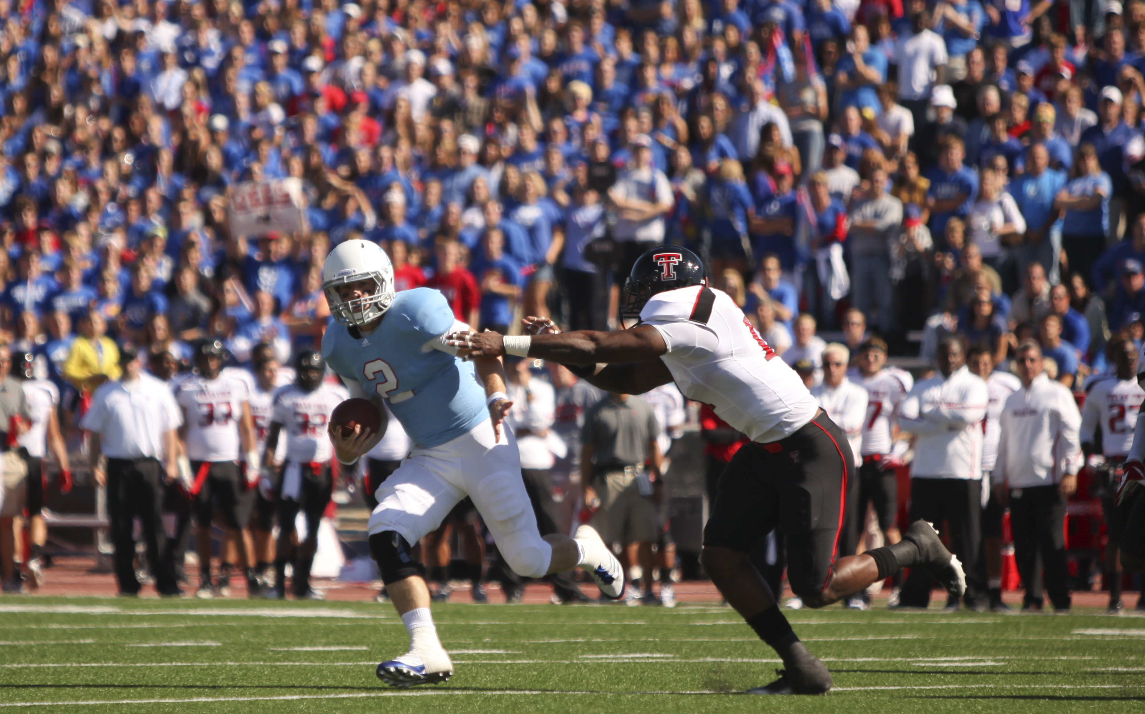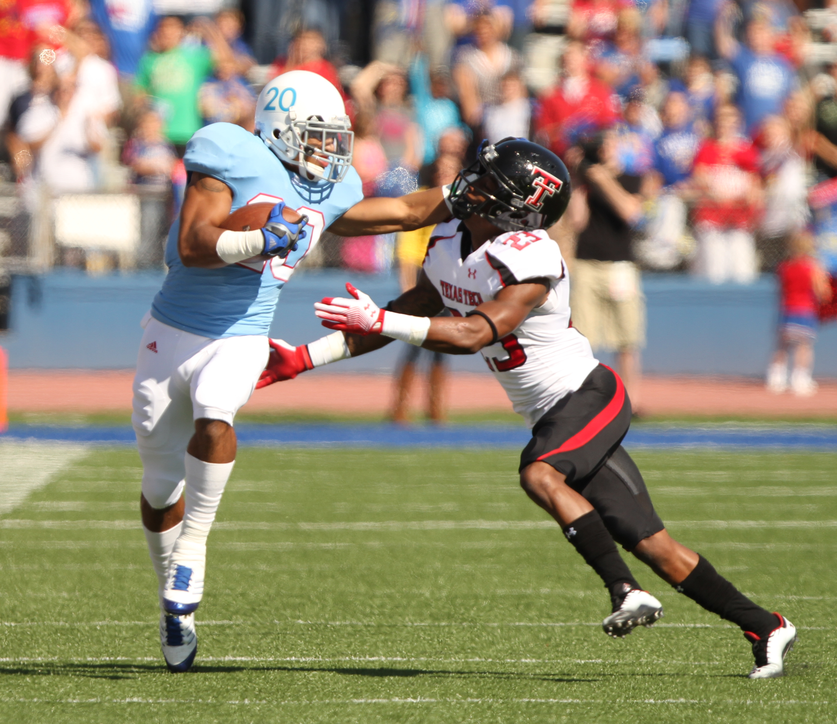 Kansas kick returner D.J. Beshears stiff-arms Texas Tech special teams player Ben McRoy during the return of the opening kickoff on Saturday, Oct. 1, 2011 at Kivisto Field.