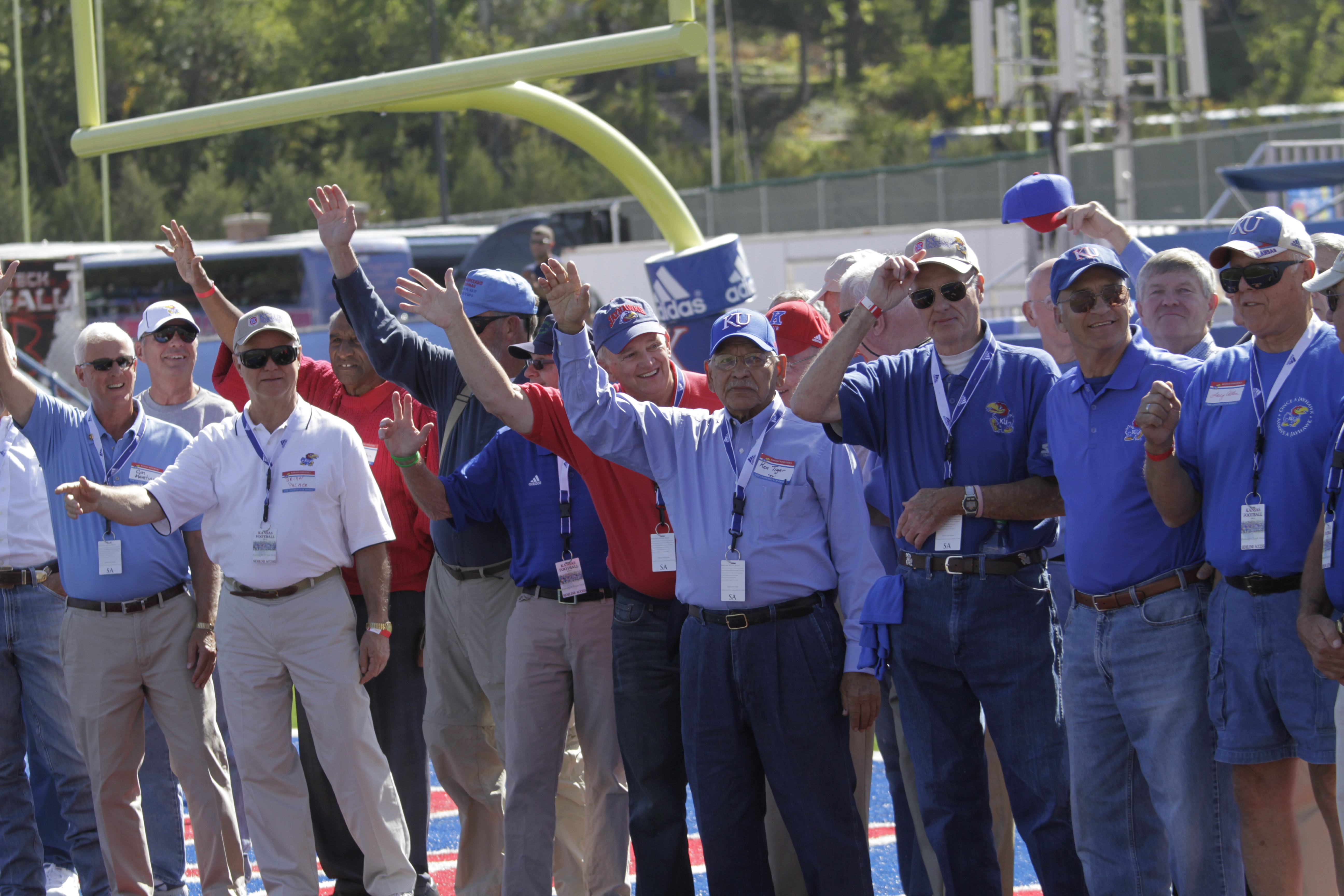 Members of the 1961 Kansas team that won the Blue Bonnet Bowl gather for a photo after a introduction during the first half of the KU's game against Texas Tech on Saturday, Oct. 1, 2011, at Memorial Stadium.