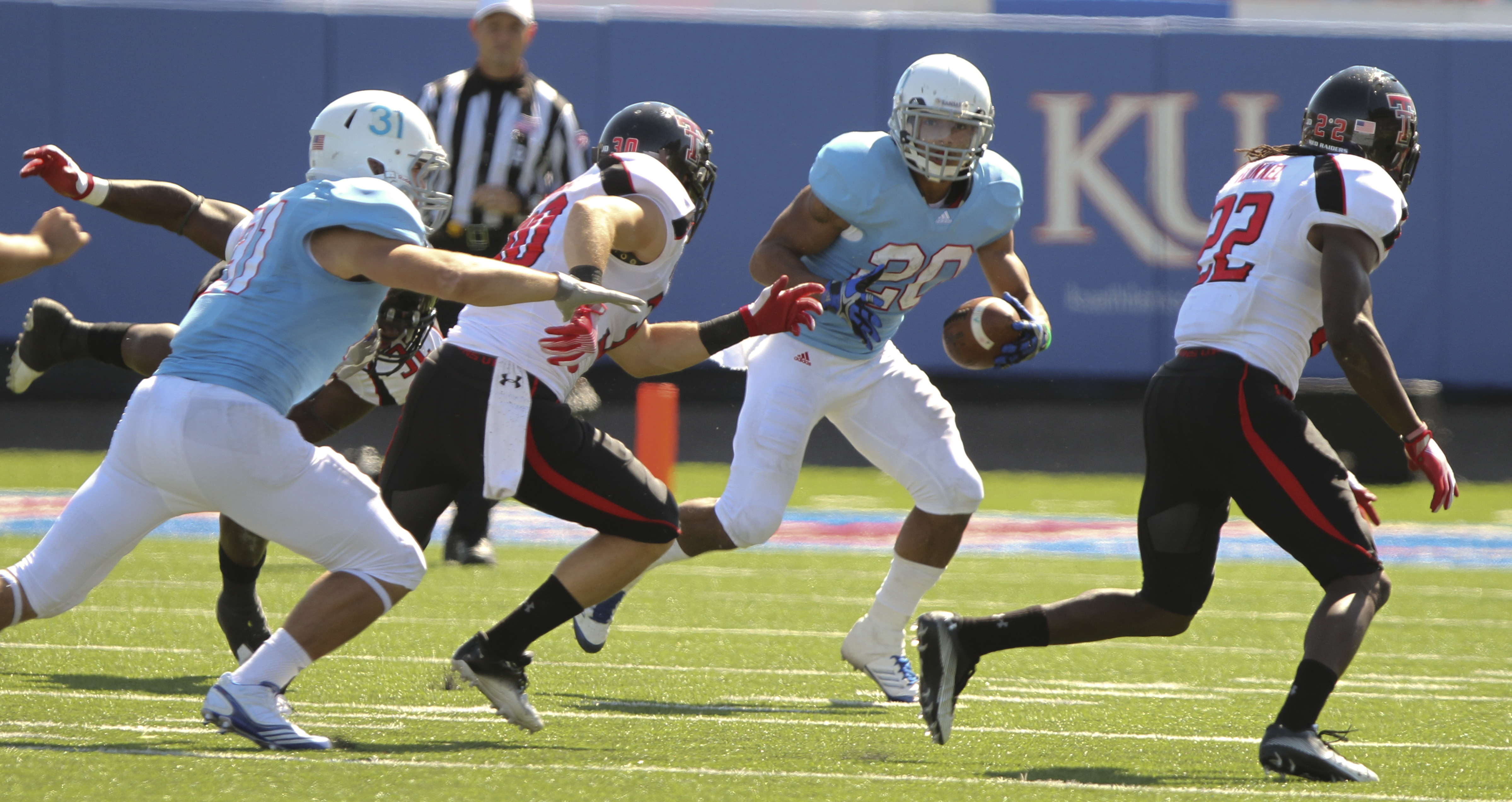 Kansas returner D.J. Beshears looks to evade the Texas Tech defense during a return in the third quarter on Saturday, Oct. 1, 2011 at Kivisto Field.
