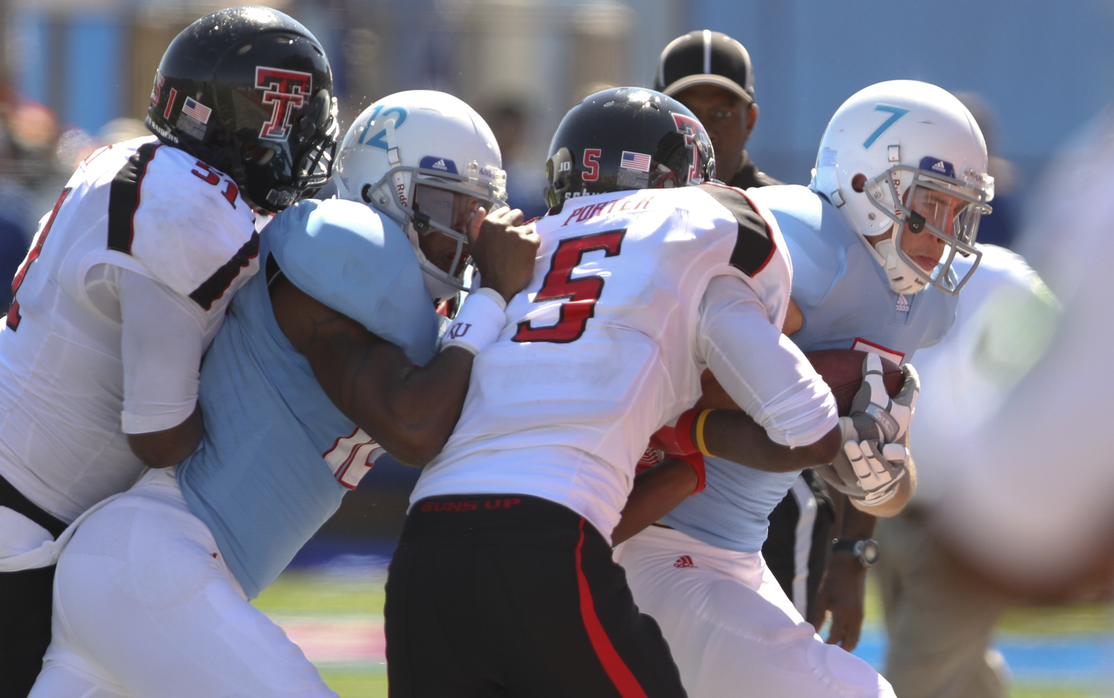 Kansas receivers Kale Pick (7) and Christian Matthews (12) are both forced out of bounds by Texas Tech defenders Tre Porter (5) and Cqulin Hubert (51) during the third quarter on Saturday, Oct. 1, 2011 at Kivisto Field.
