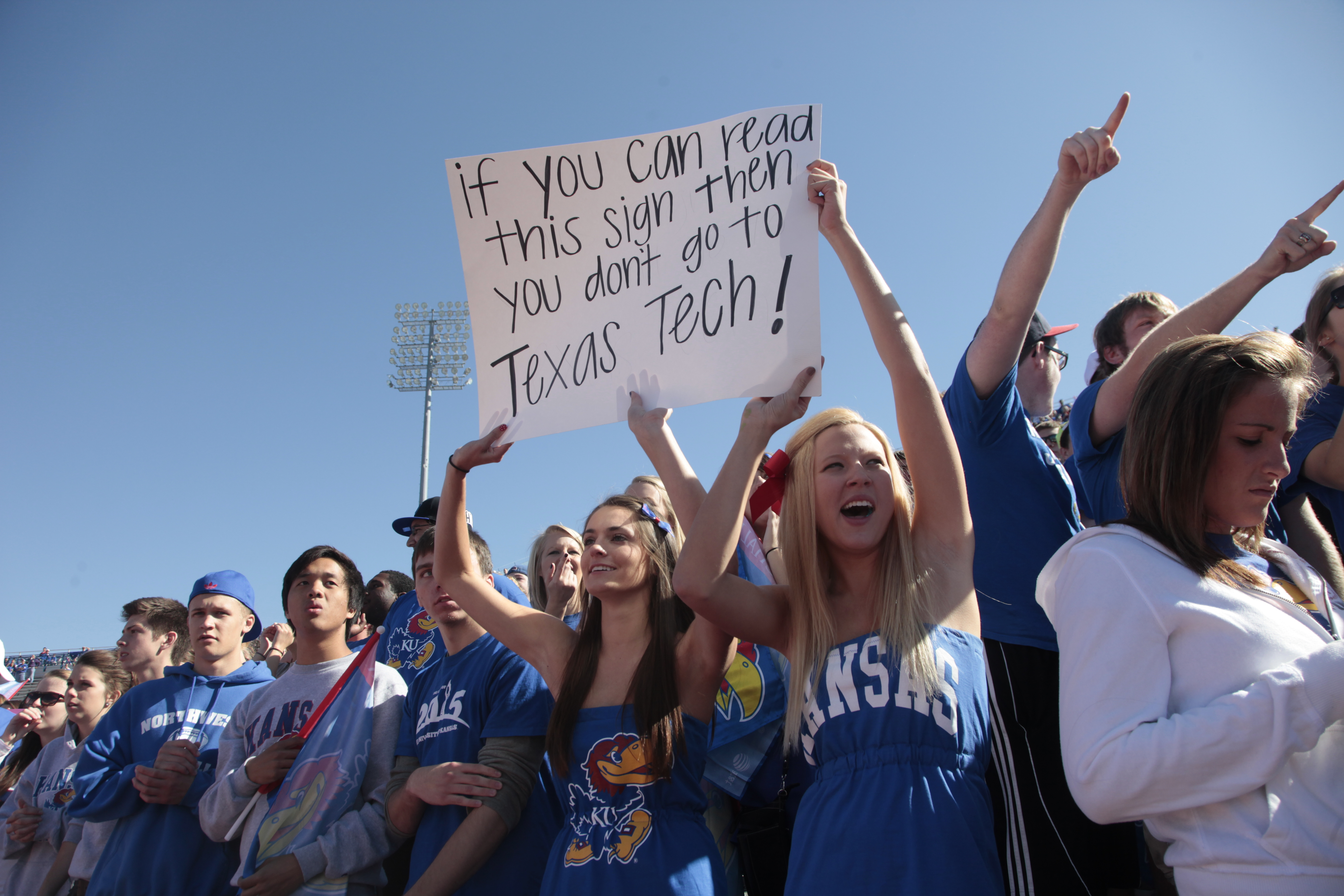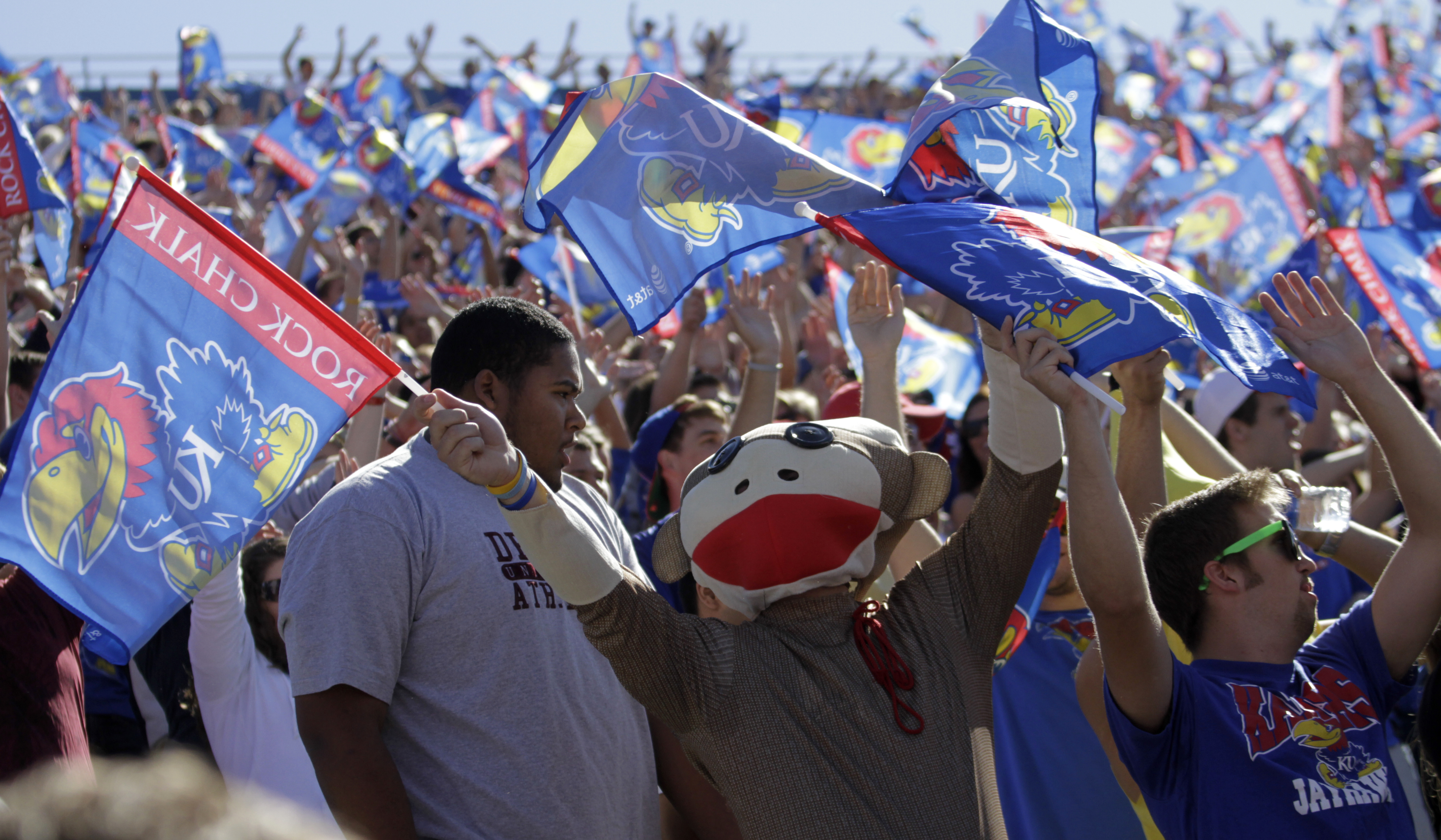 Kansas University fans cheer for the Jayhawks during the homecoming game against Texas Tech on Saturday, Oct. 1, 2011, at Memorial Stadium.