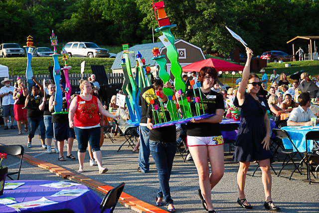 Van Go apprentice artists display their handpainted birdbaths during the art auction for Van Go’s annual fundraiser “What Floats Your Boat?” on June 18 at Clinton Marina. More than 650 guests attended with proceeds going toward Van Go’s programming. Van Go is a nonprofit that provides arts-focused job-training to at-risk youth, ages 14-21, in Lawrence.