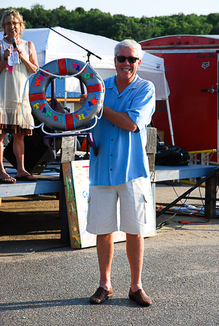 Mike Treanor of Treanor Architects holds his “What Floats Your Boat?” sponsor trophy from the June 18 event at Clinton Marina. Treanor Architects was this year’s largest sponsor, earning the title “Titan of the Lake.” Van Go executive director Lynne Green, is pictured in the background. Central National Bank, another WFYB sponsor, earned the title “Captain of the Ship.”