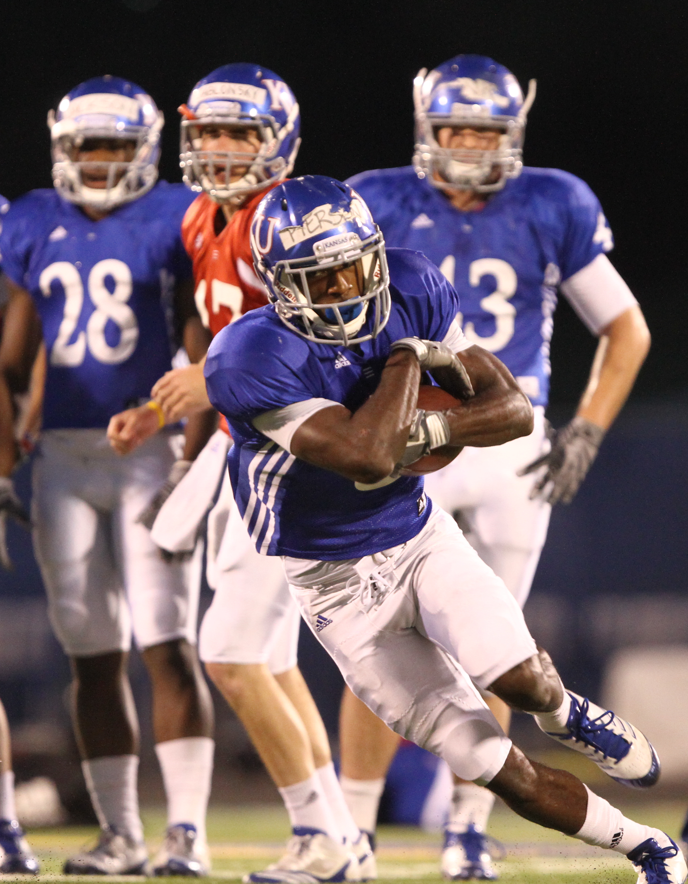 Kansas running back Brandon Bourbon catches a pass during warmups on Thursday, April 19, 2012 at Memorial Stadium.