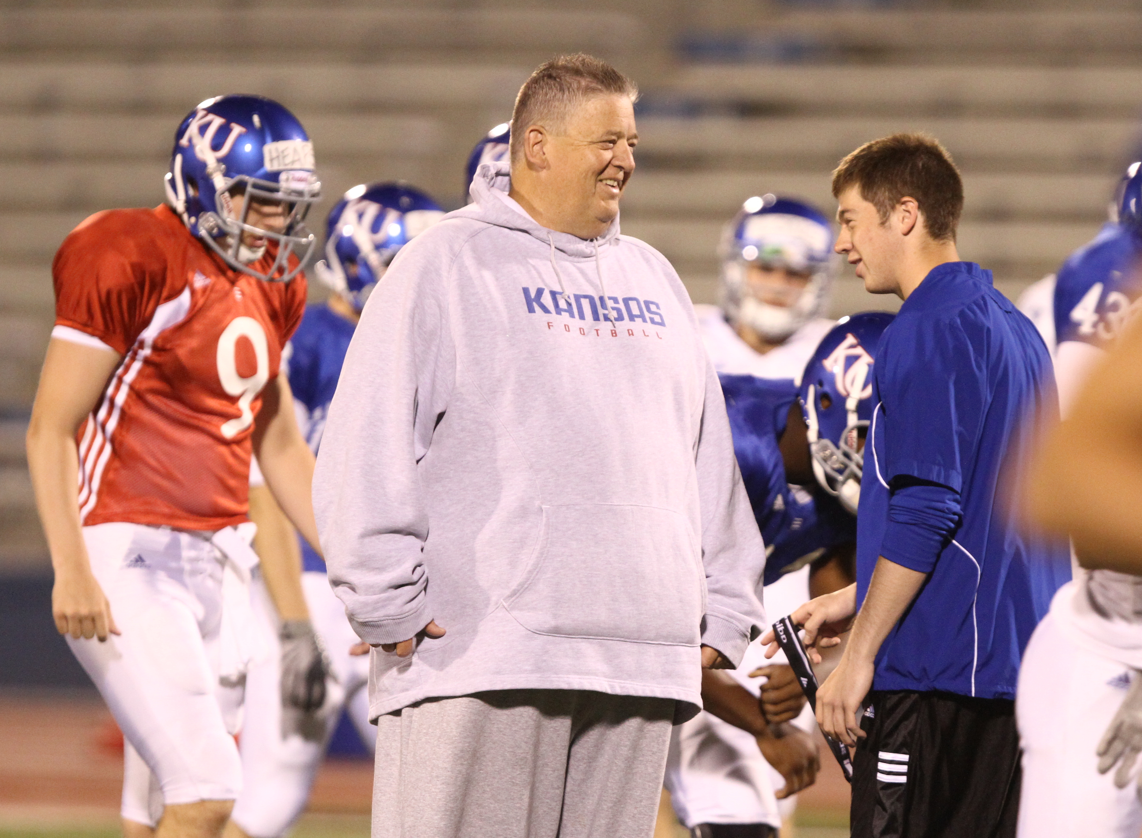 Defensive coordinator Dave Campo claps his hands as the Jayhawks take the field for a 6 a.m. practice on Thursday, April 19, 2012 at Memorial Stadium.
