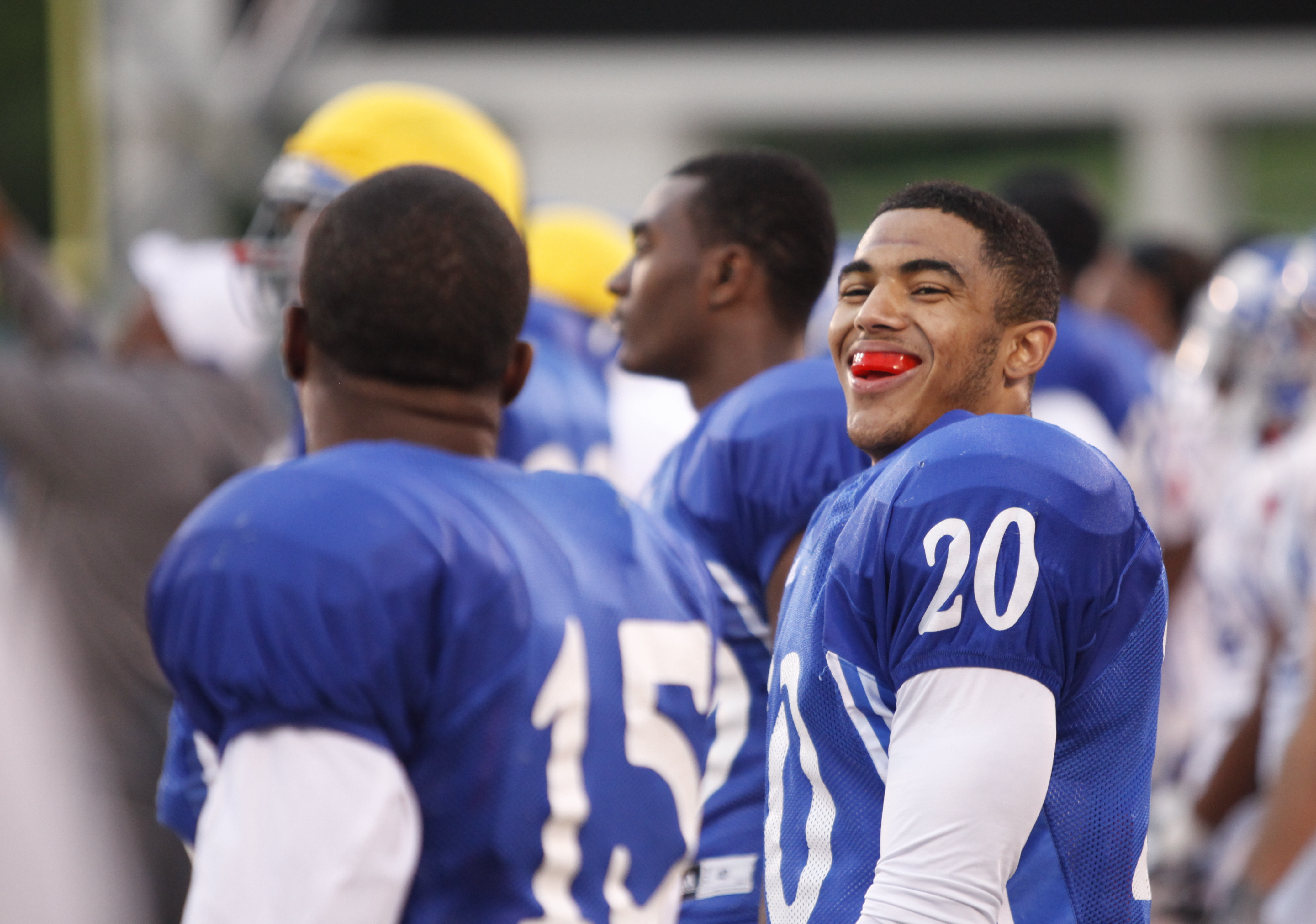 Receivers D.J. Beshears (20) and Daymond Patterson (15) have a laugh on the sidelines during a morning practice on Thursday, April 19, 2012 at Memorial Stadium.