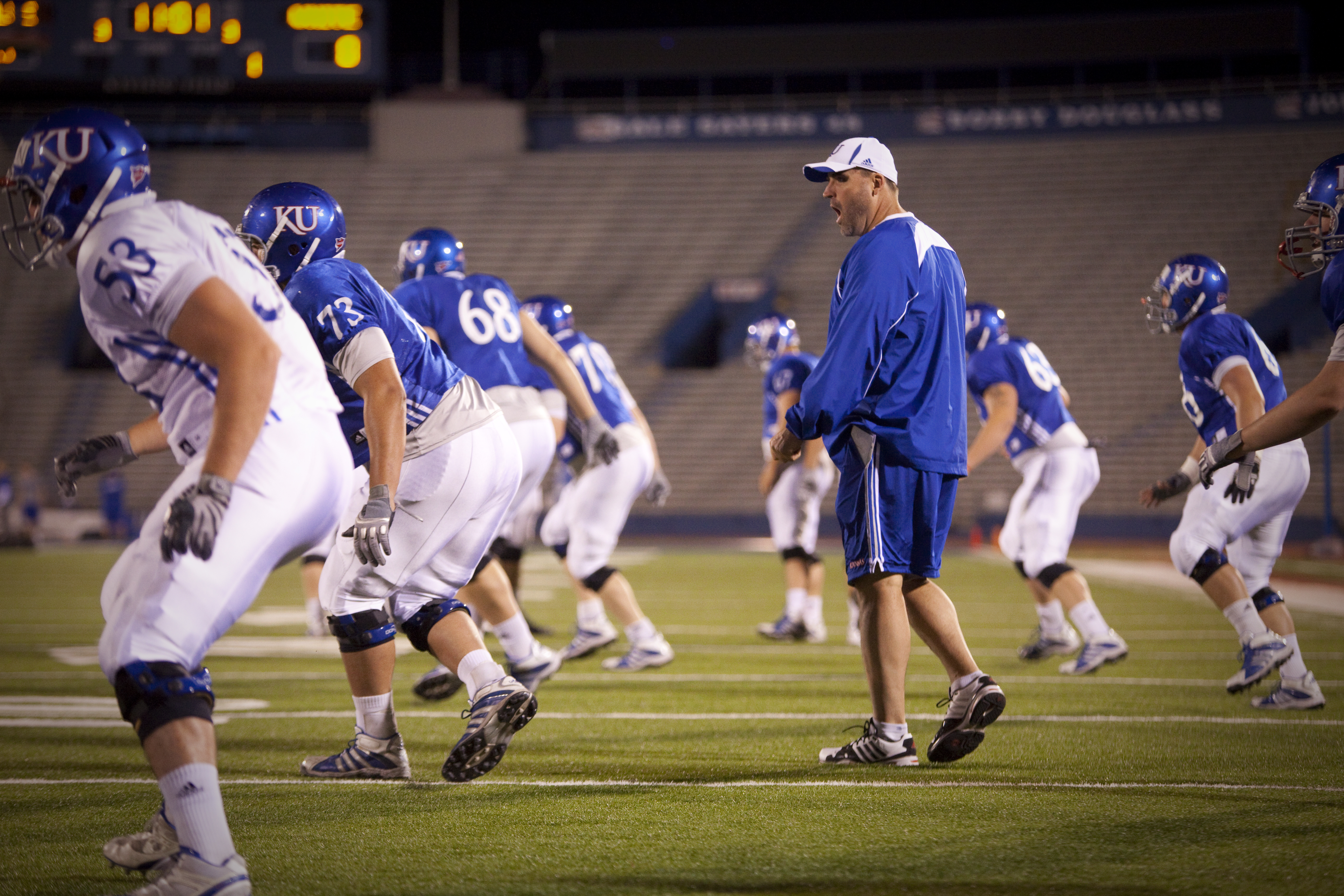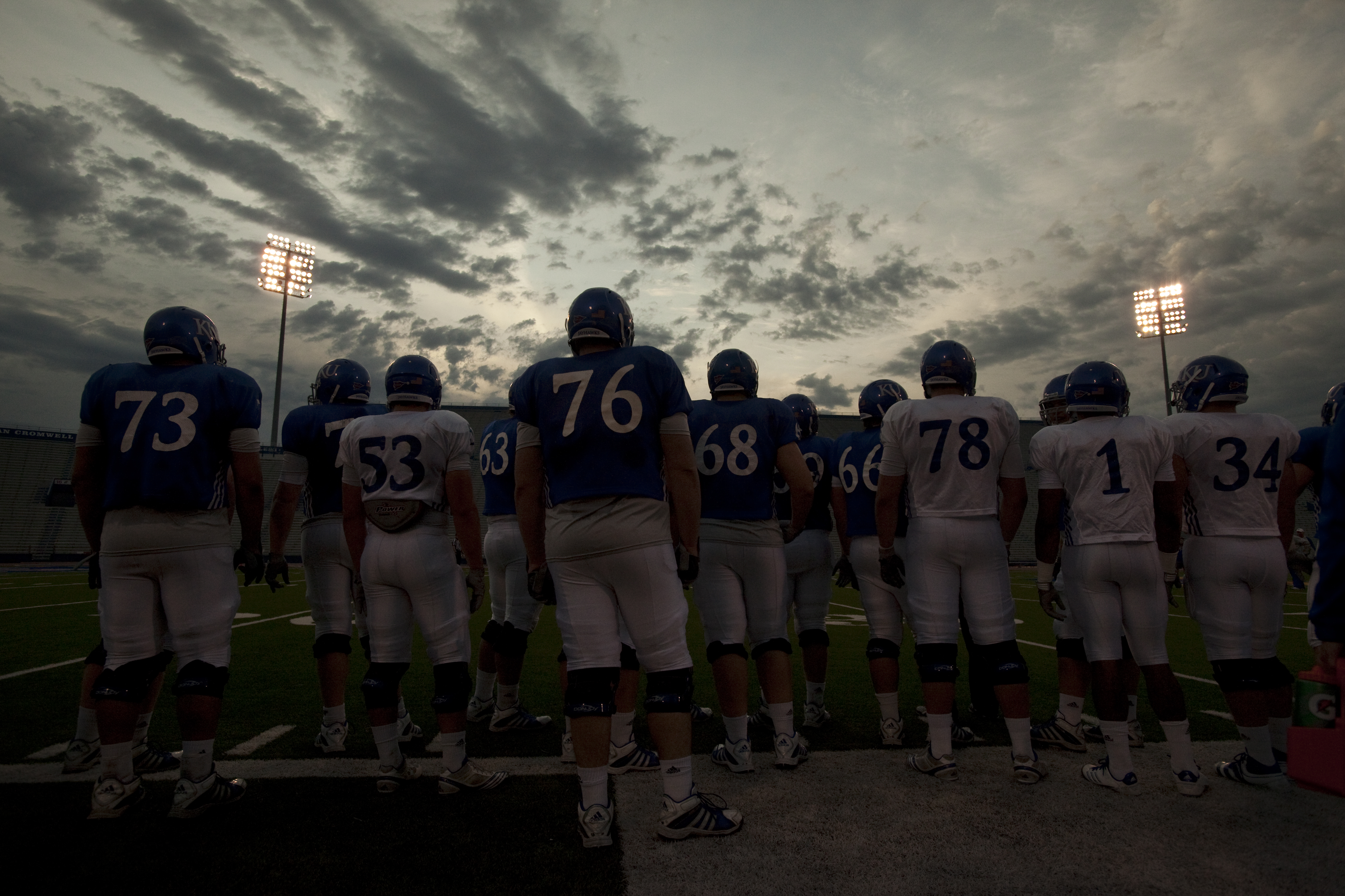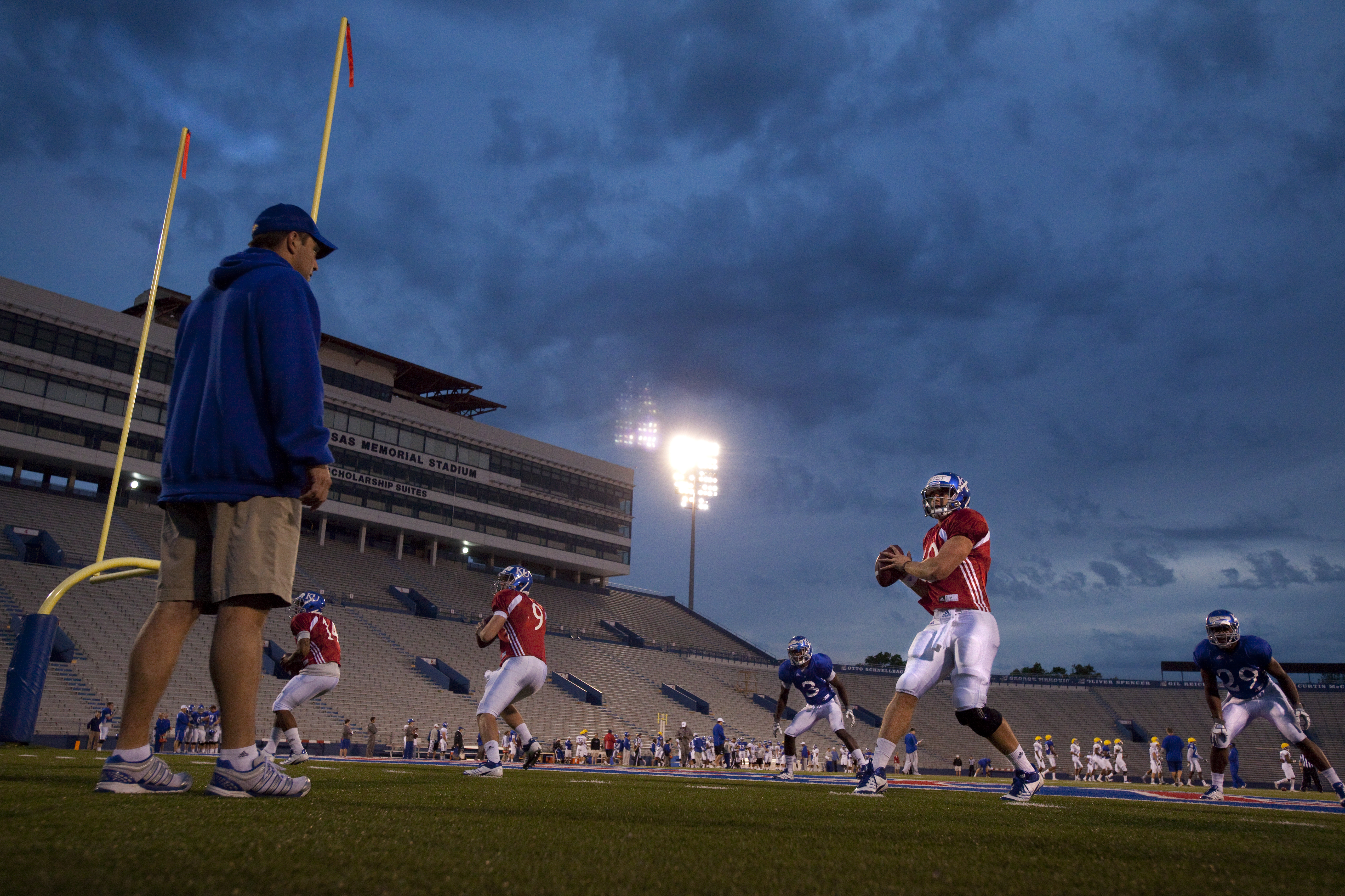 The sky begins to lighten behind campus as the Jayhawks run through offensive drills during a morning practice on Thursday, April 19, 2012 at Memorial Stadium.