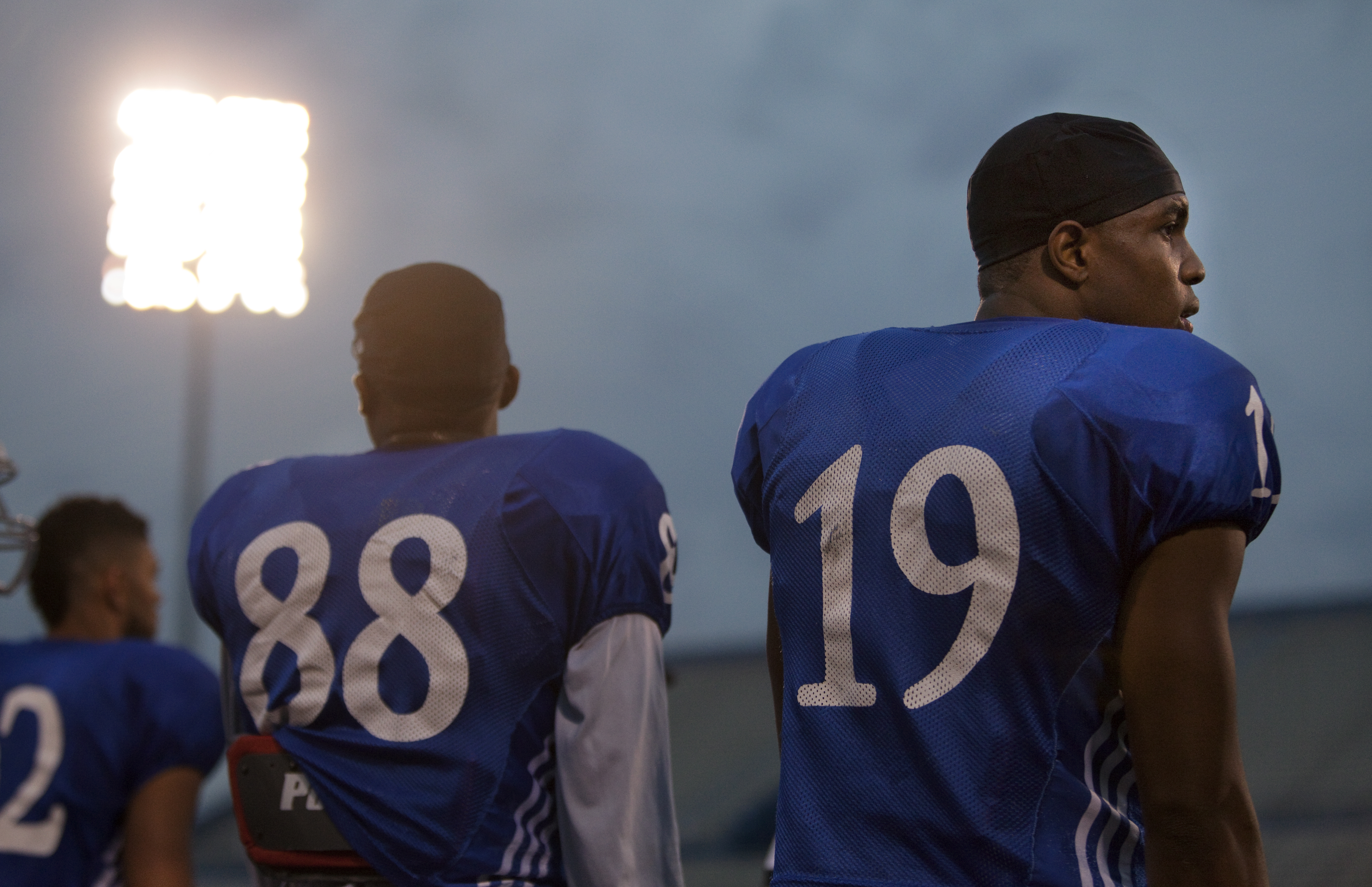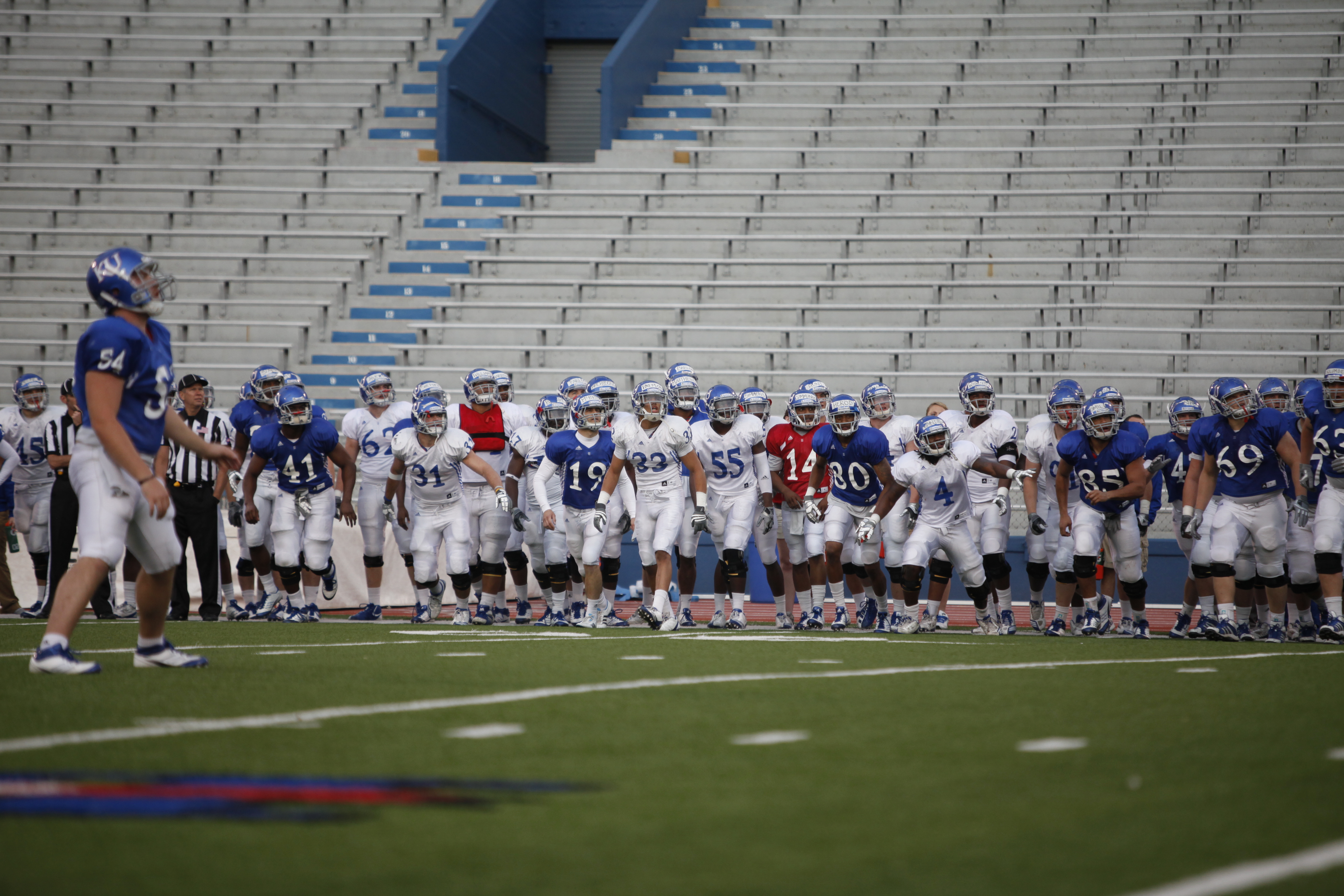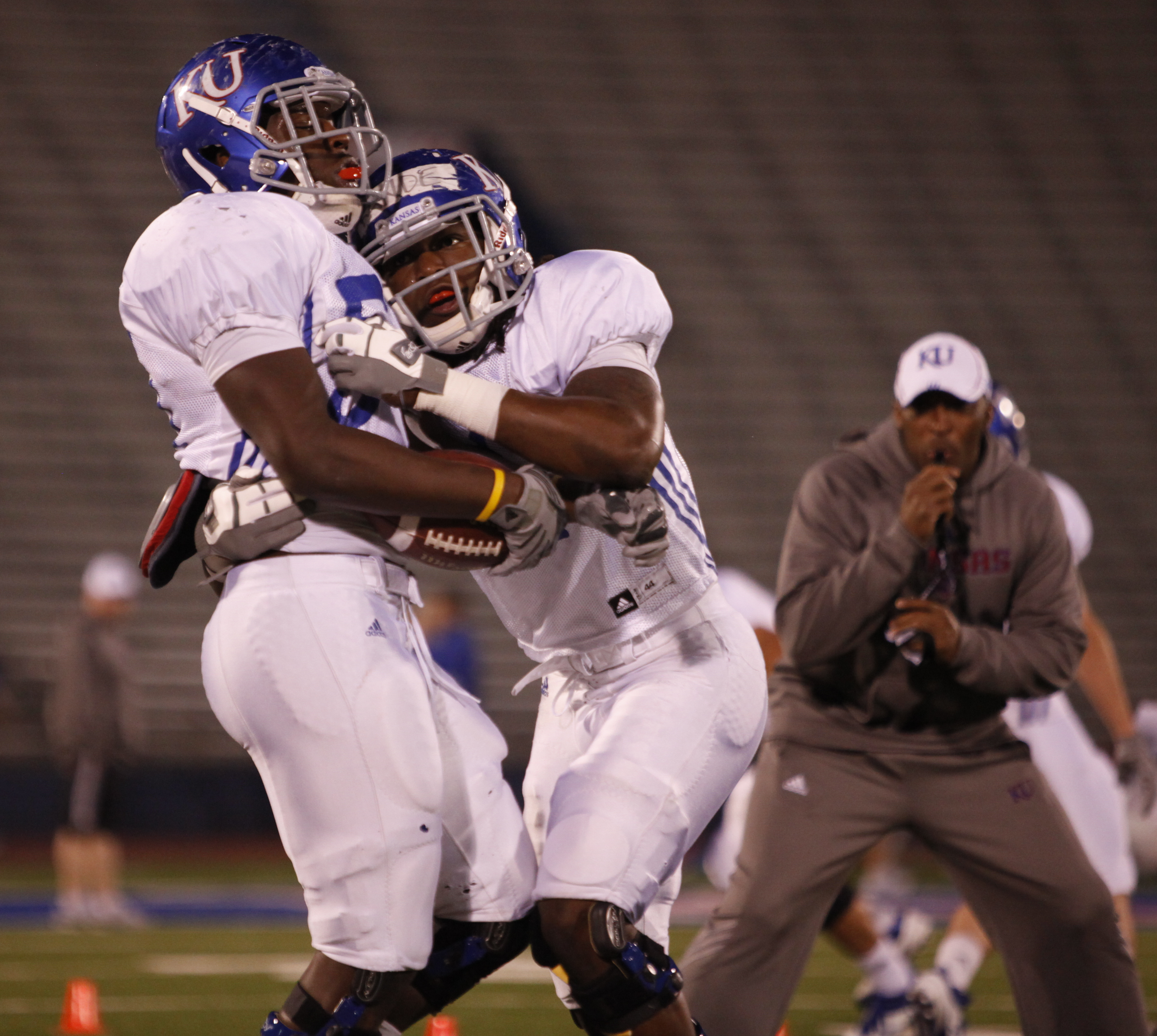 The sky begins to lighten behind campus as the Jayhawks run through offensive drills during a morning practice on Thursday, April 19, 2012 at Memorial Stadium.