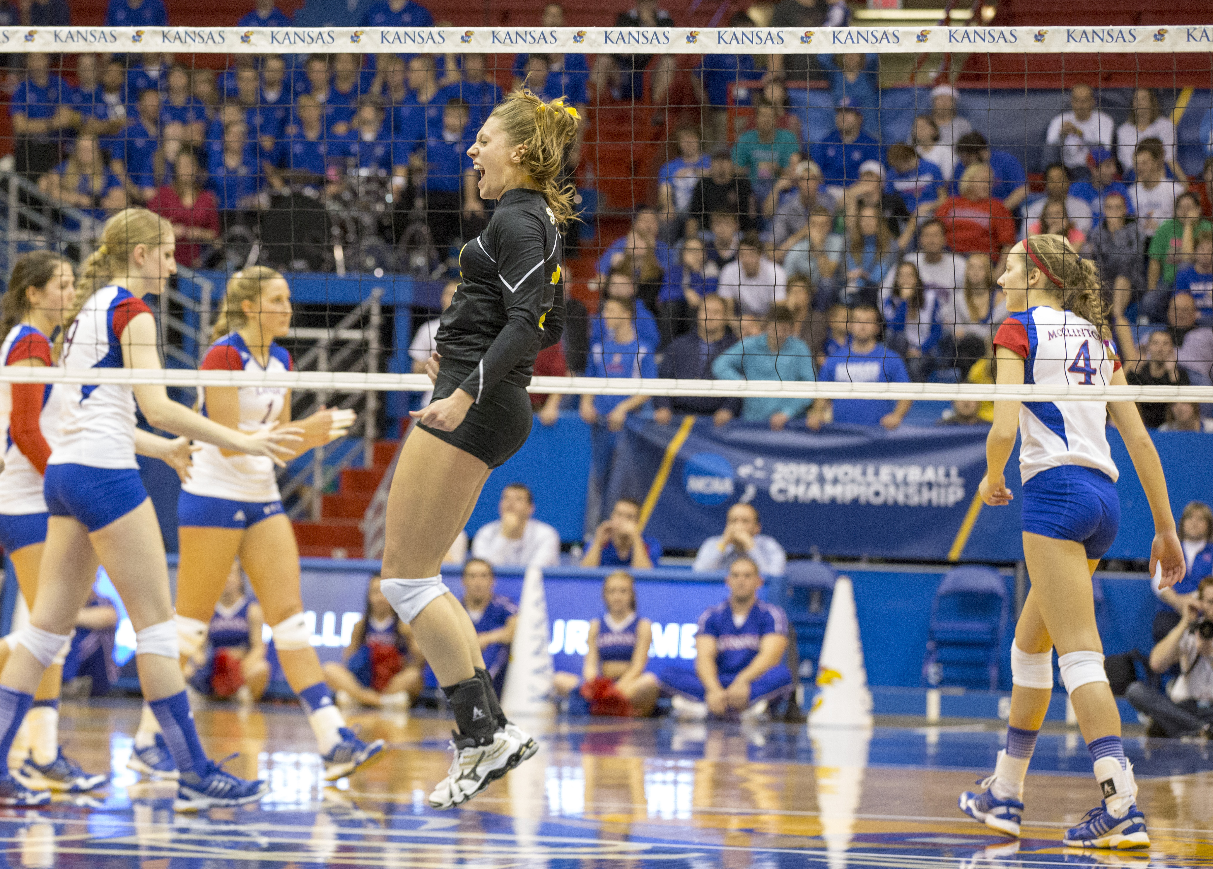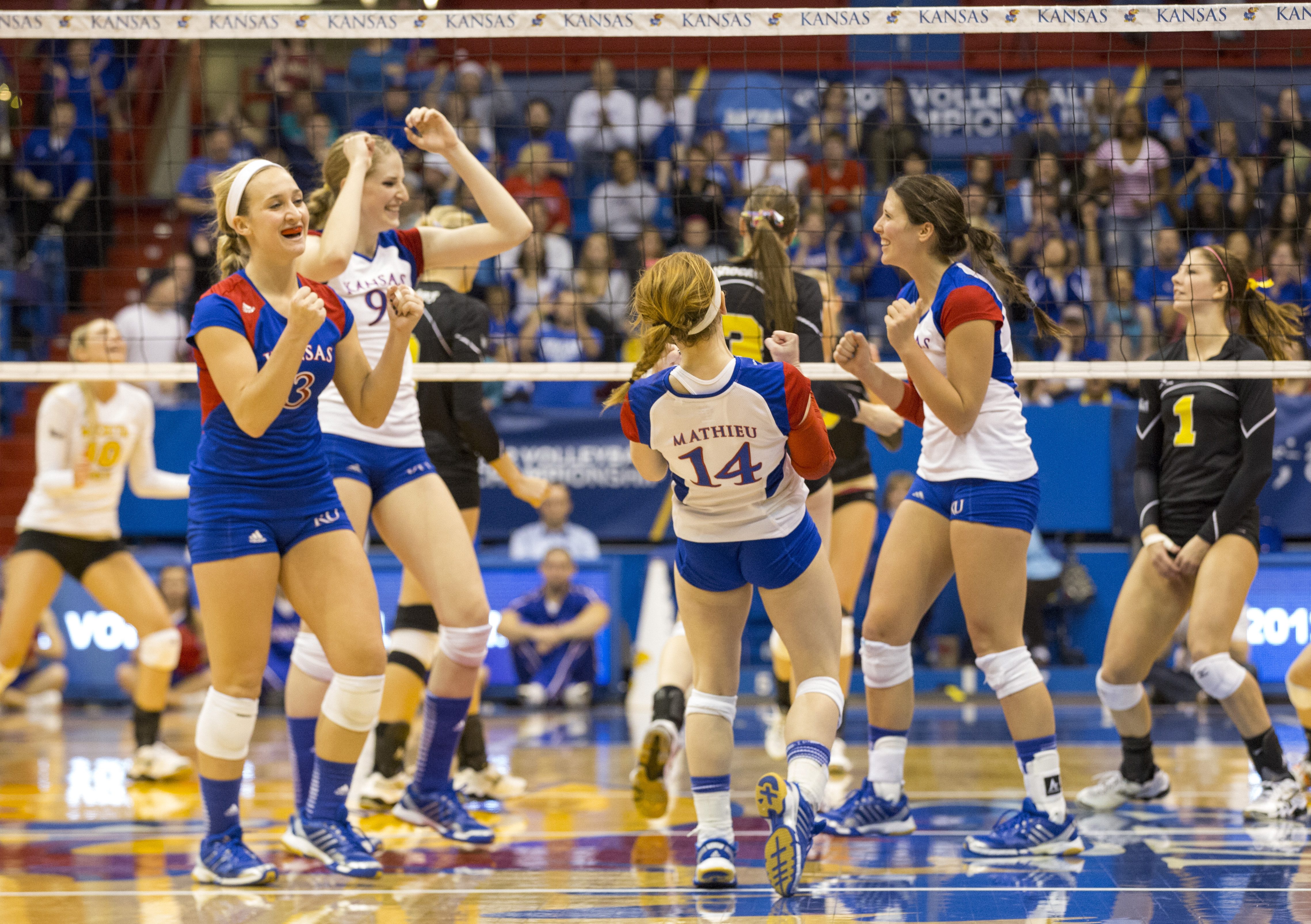 Wichita State's Katie Reilly celebrates a point as Kansas players move to huddle during Kansas' second round NCAA tournament game against Wichita State, Saturday, Dec. 1, 2012 in Allen Fieldhouse. The Jayhawks fell, 3-1, and with the loss their season ended.