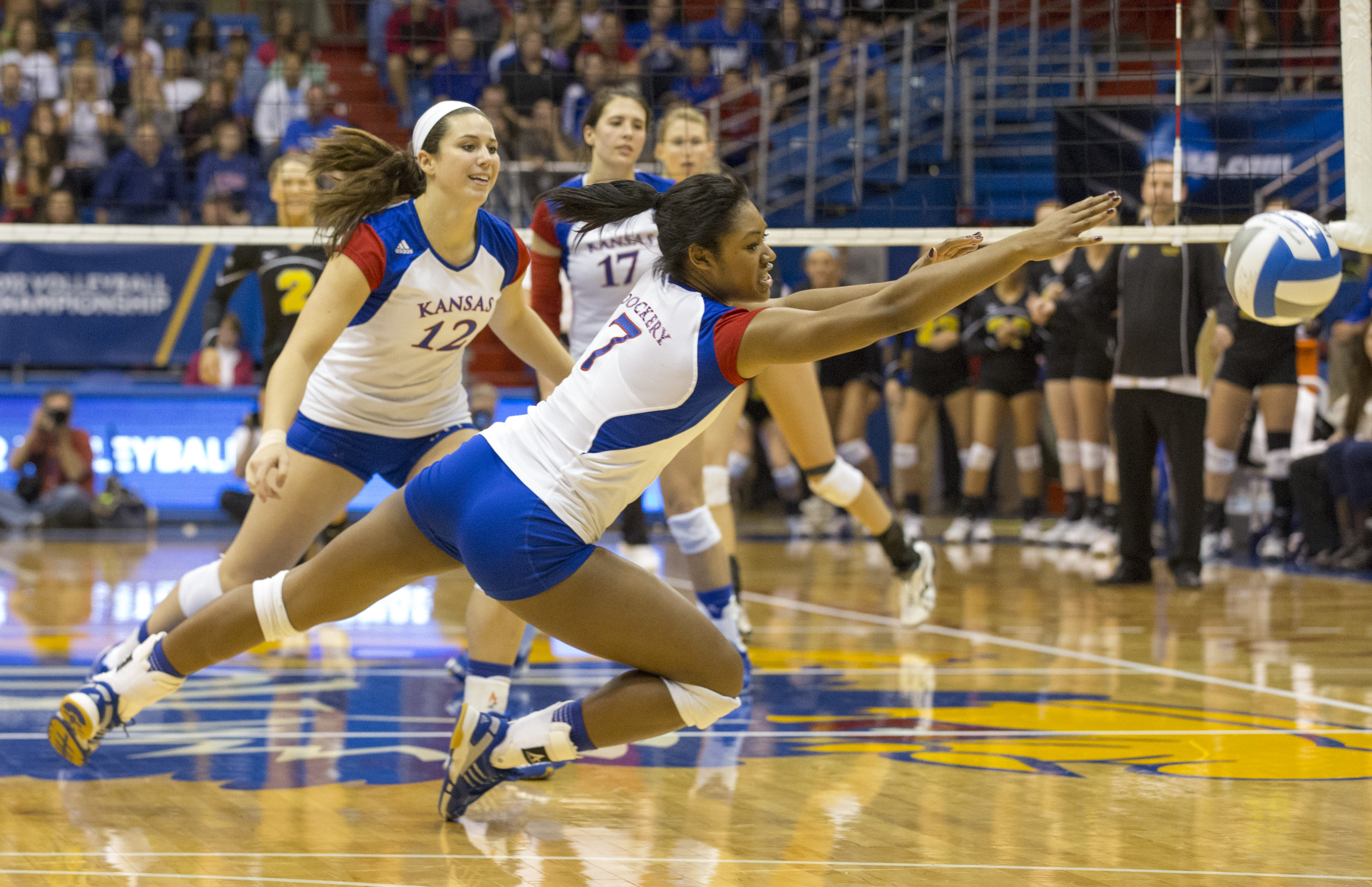 Kansas' Brianne Riley gets turned upside down as she is unable to make a dig during Kansas' second round NCAA tournament game against Wichita State, Saturday, Dec. 1, 2012 in Allen Fieldhouse. The Jayhawks fell, 3-1, and with the loss their season ended.