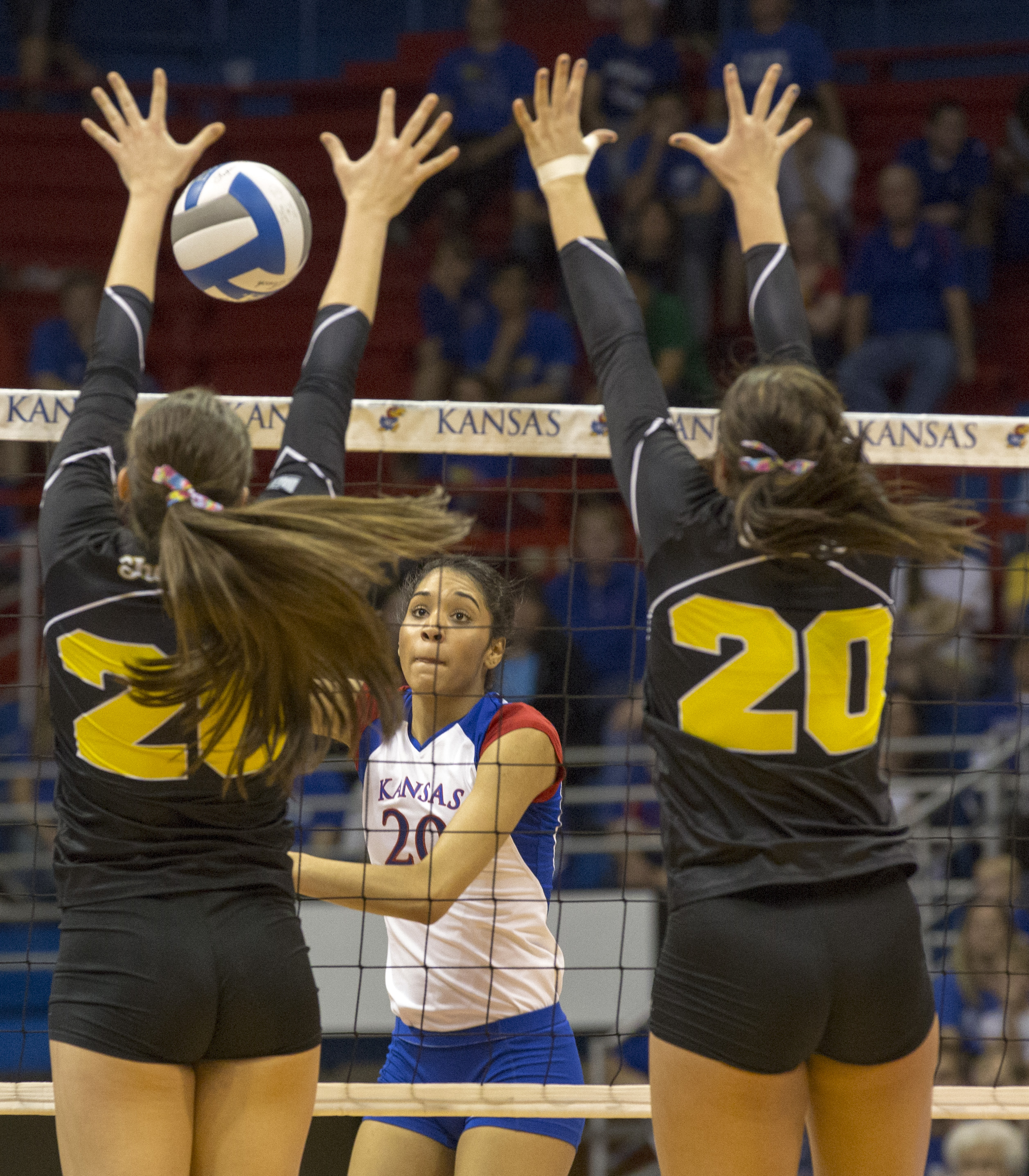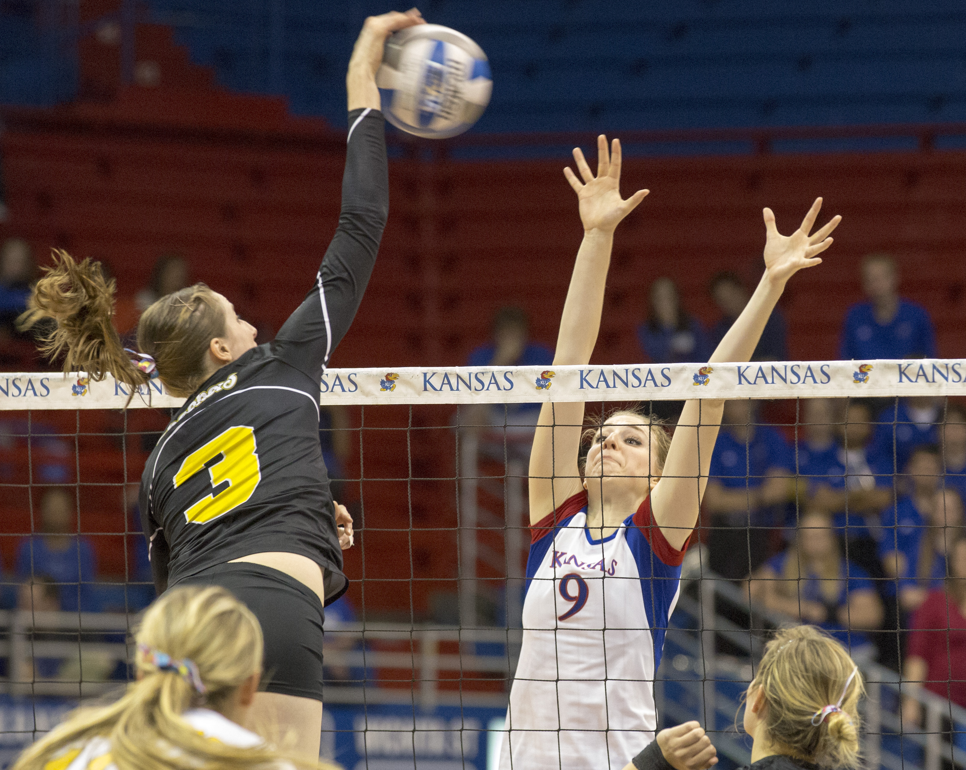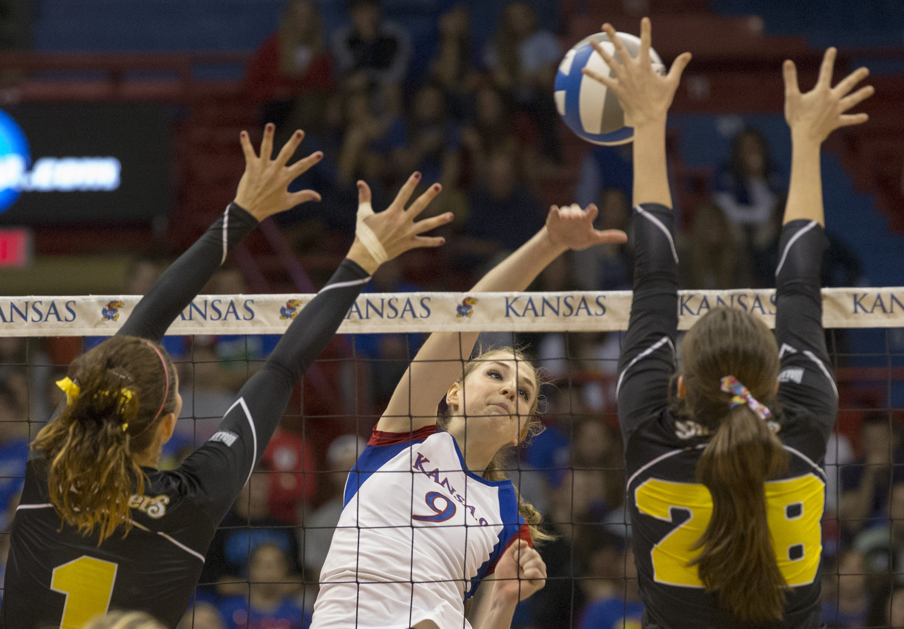 Kansas' Caroline Jarmoc (9) tries to hit a shot past blockers Ashlyn Driskill, left, and Ashley Andrade (28) during Kansas' second round NCAA tournament game against Wichita State, Saturday, Dec. 1, 2012 in Allen Fieldhouse. The Jayhawks fell, 3-1, and with the loss their season ended.