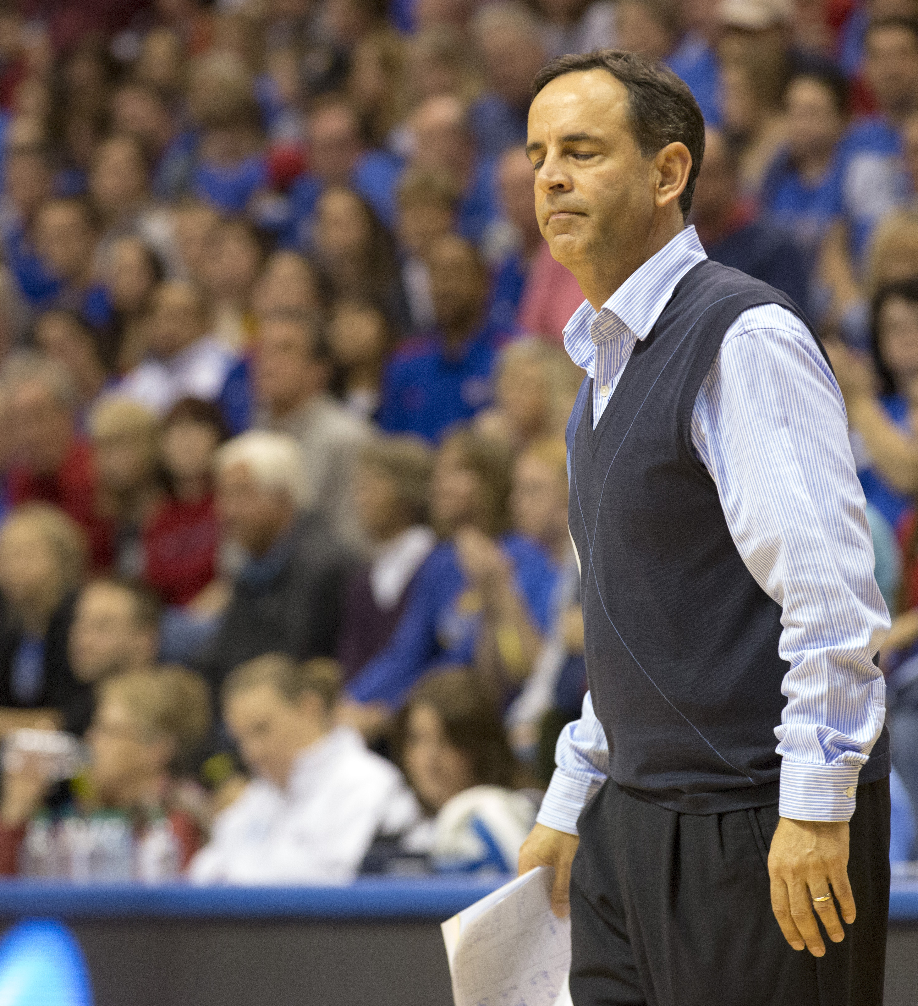 Kansas coach Ray Bechard reacts to a Wichita State point during Kansas' second round NCAA tournament game against Wichita State, Saturday, Dec. 1, 2012 in Allen Fieldhouse. The Jayhawks fell, 3-1, and with the loss their season ended.