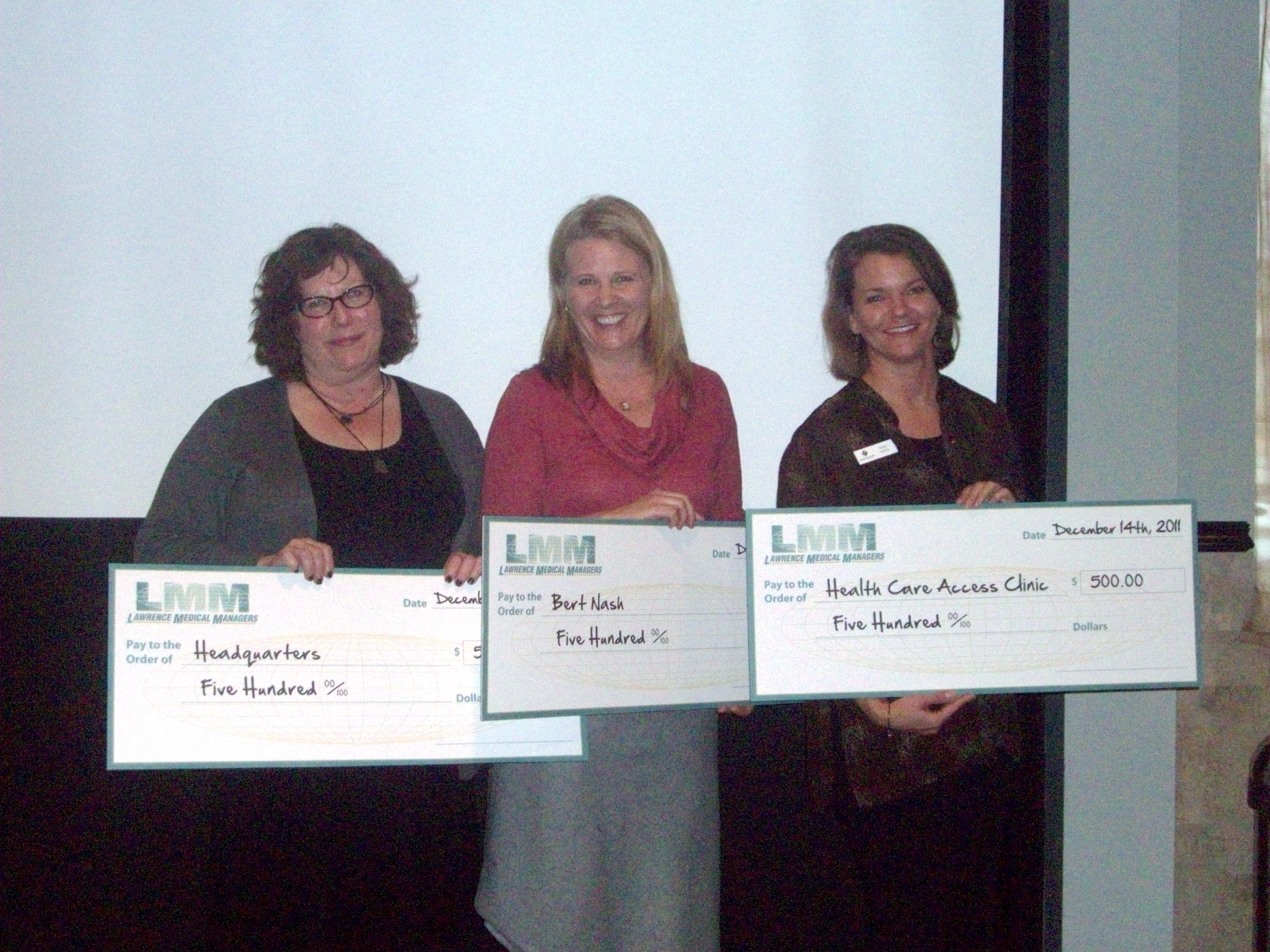 The Lawrence Medical Managers presented three local agencies with $500 each at their Dec. 14, 2011, member meeting at Maceli’s. Accepting the donations on behalf of their agencies were, from left, Marcia Epstein, director of Headquarters Counseling Center; Cindy Hart, development director with Bert Nash Community Mental Health Center; and Nikki White, executive director for Health Care Access Clinic. Dena Johnston submitted the photo.