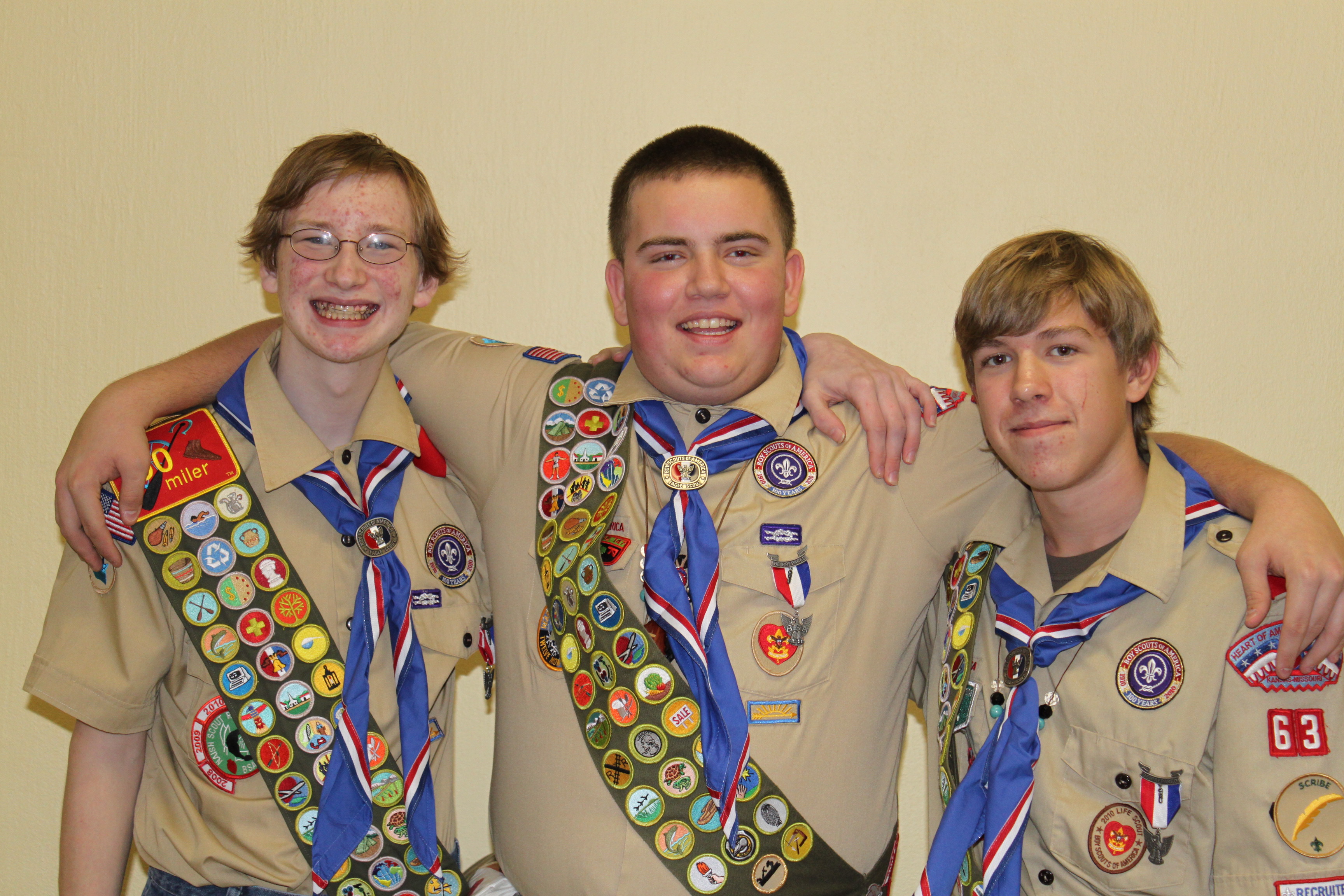 From left, Ted Shields, Derek Brunk and Sebaston Steeb, of Boy Scout Troop No. 63 of Wellsville have earned the rank of Eagle Scout. Ted, who has 39 merit badges, completed a DVD movie drive to benefit patients in the Medical Surgical unit at Olathe Medical Center. Derek, who has 35 merit badges, collected supplies and money to benefit the Prairie Paws Animal Shelter in Ottawa. Sebaston, who has 44 merit badges, designed, built and installed bird houses to benefit science students of the Wellsville school district. Michael Shields, assistant scout master, submitted the photo.