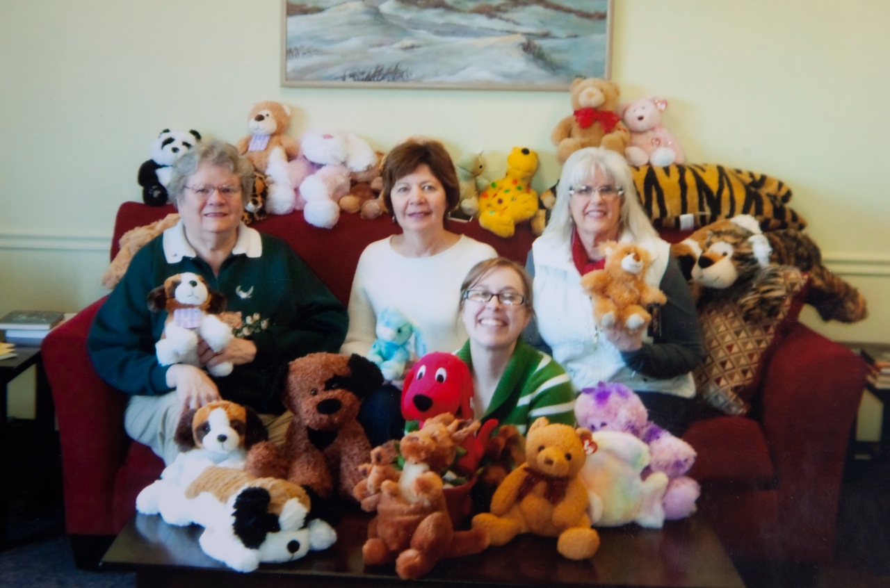 The Omicron Chapter of Delta Kappa Gamma donated 36 stuffed animals to The Willow Domestic Violence Center in January. The animals are given to children who are brought to the center to give them a sense of comfort and security. Pictured, from left, are Cathey Parsons, Omicron president, Janine Monaghan, Omicron member, Becca Burns (seated), Willow center director of volunteer services, and Joan Schultz, Willow center executive director, all of Lawrence. Royce Parsons took the photo, which was submitted by Cathey Parsons.