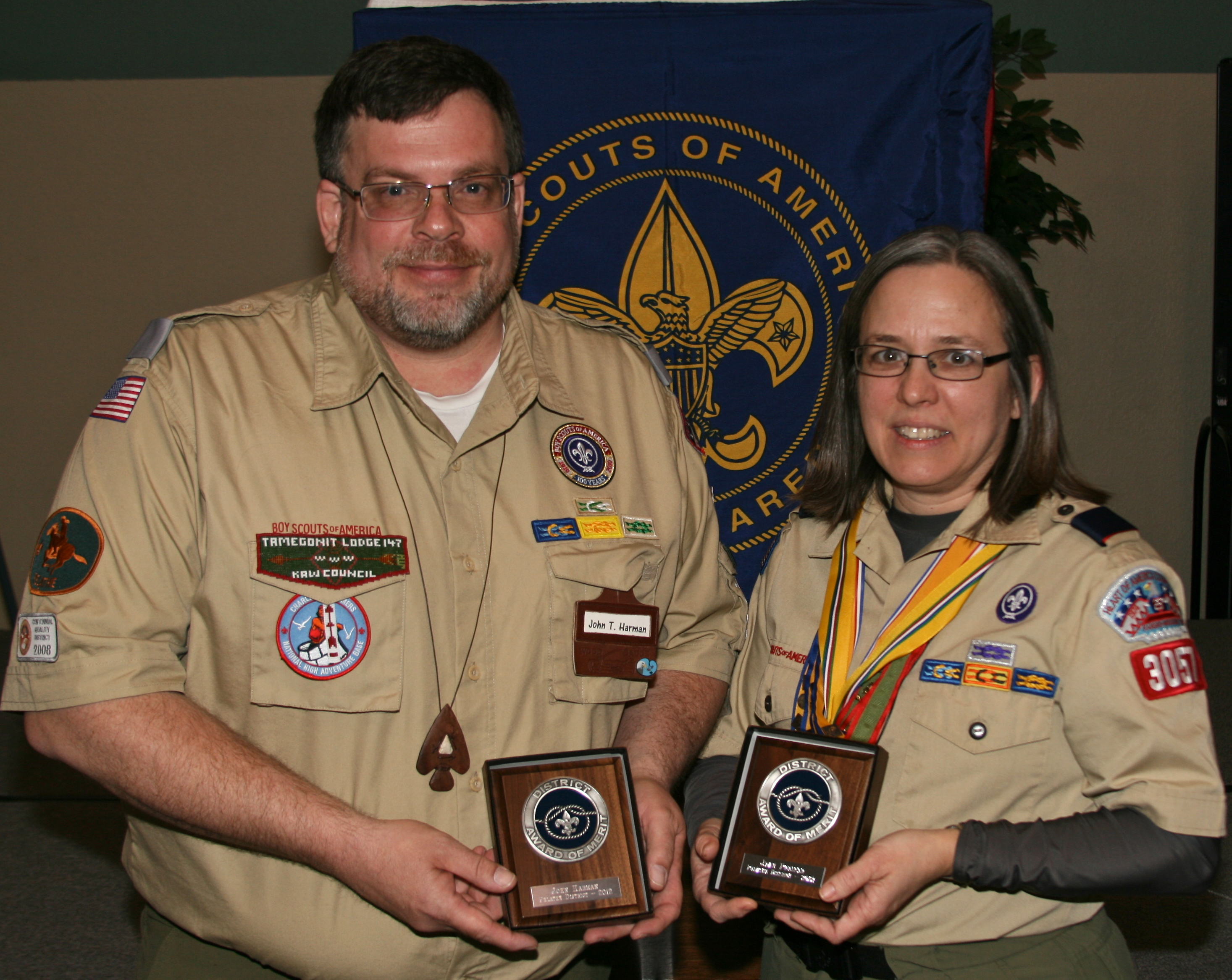 The Pelathe District of the Boy Scouts presented the Award of Merit to district commissioner John Harmon and Cub Scout leader Jean Pfiefer during its annual recognition dinner Feb. 2 at First Baptist Church, 1330 Kasold Drive. The award is the highest recognition given at the district level to volunteer leaders for exceptional service in Scouting. Pfiefer was selected for her service as a Cub Scout leader with Pack 3057 at St. John’s Church and for her work with district activities, including Cub Scout Day Camp. Harmon has served as a Cub Scout leader and assistant scoutmaster with Troop 53. Keith Wood, of Lawrence, submitted the photo.