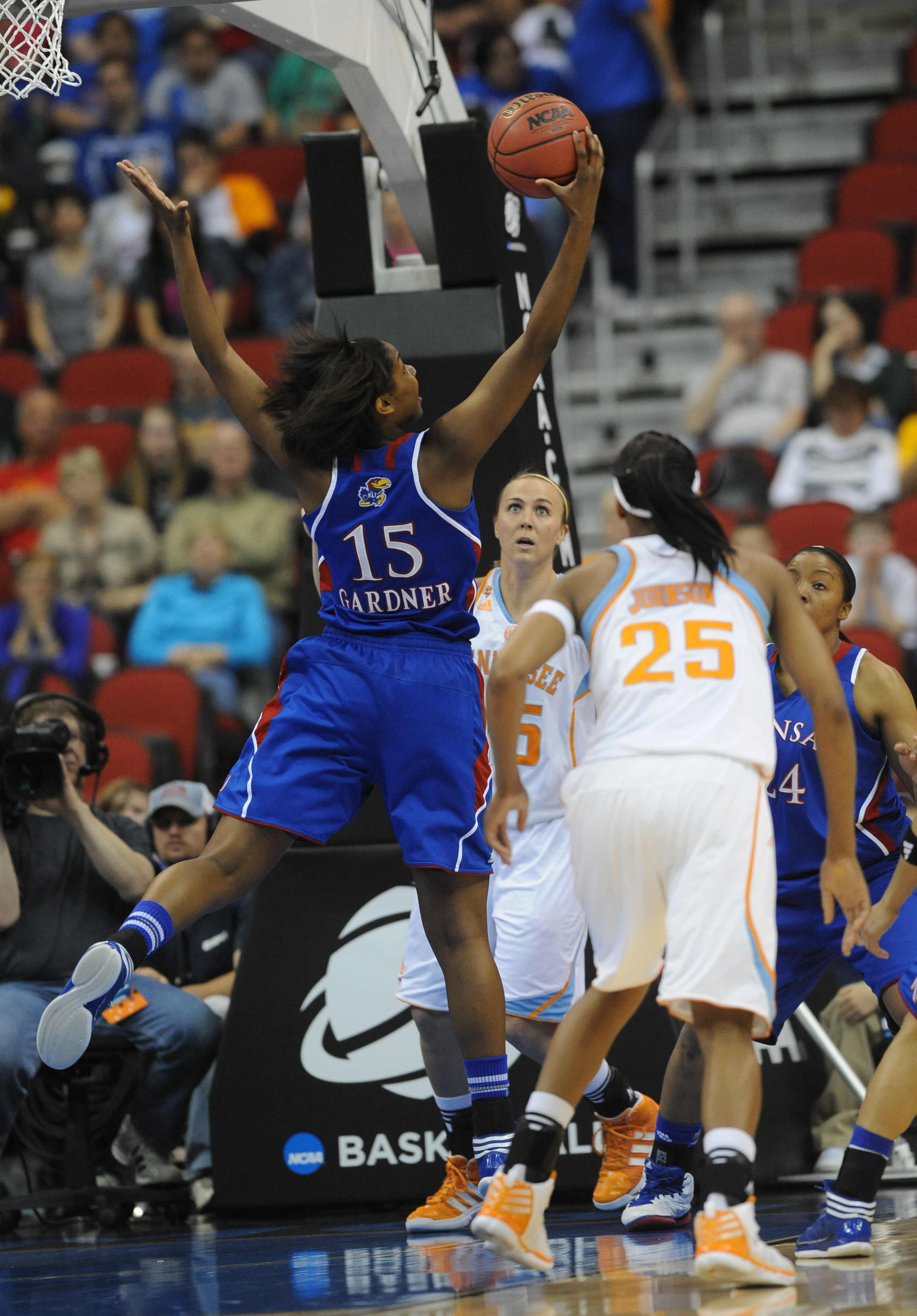 Kansas forward Chelsea Gardner goes up for a shot over Tennessee forward Vicki Baugh in the second half on Saturday March 24, 2012 in Wells Fargo Arena in Des Moines, Iowa.