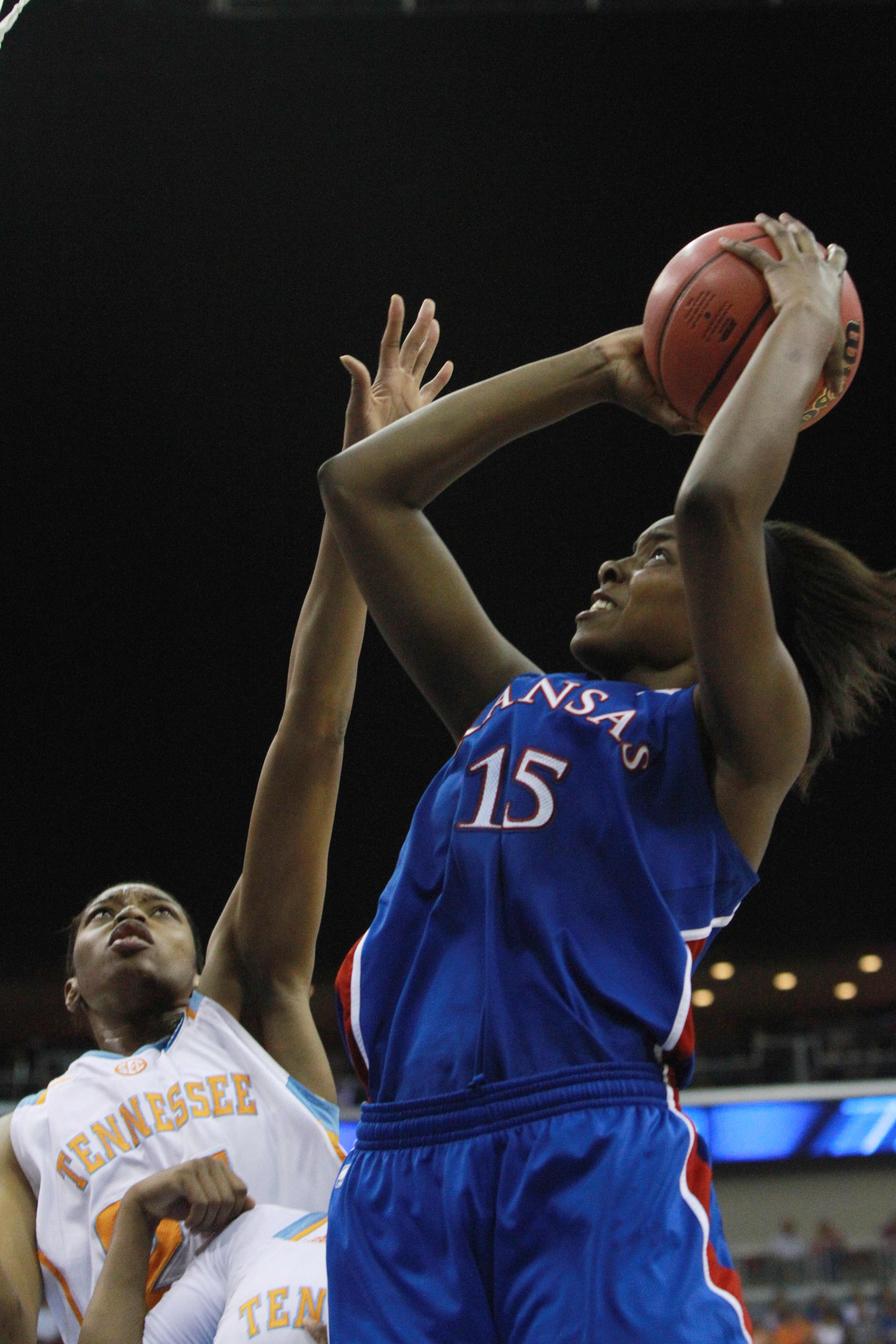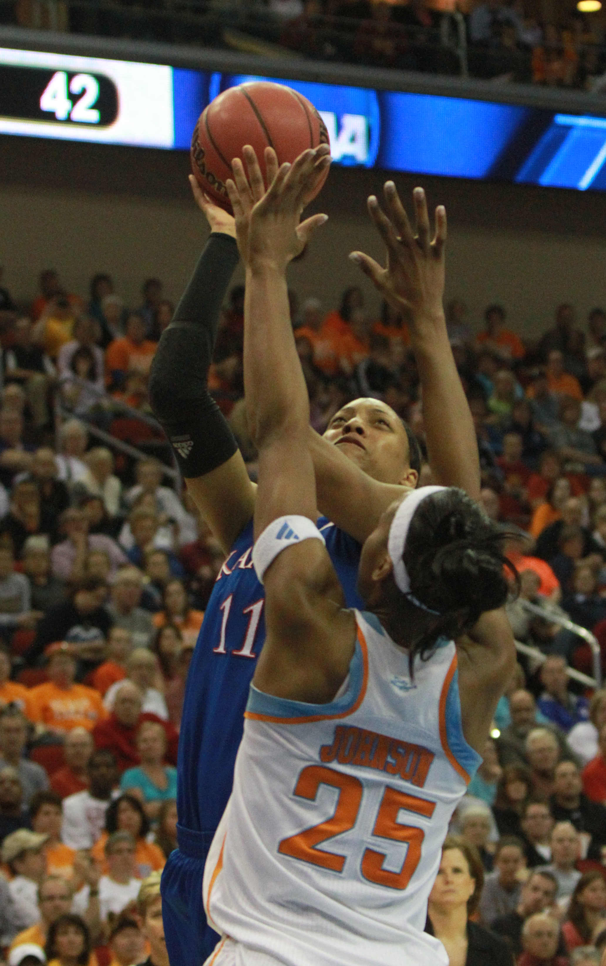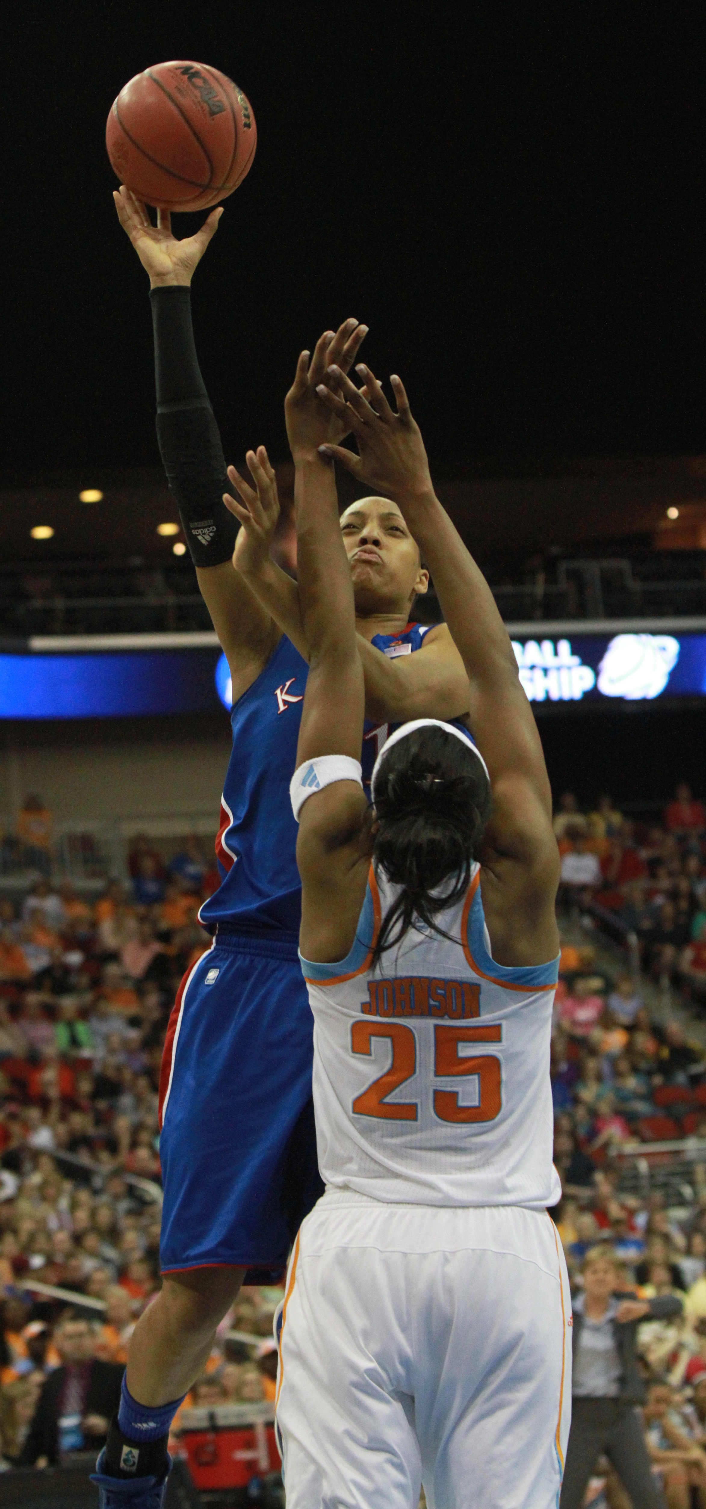 Kansas forward Aishah Sutherland gets up and over Tennessee forward Glory Johnson for a shot on Saturday March 24, 2012 in Wells Fargo Arena in Des Moines, Iowa.