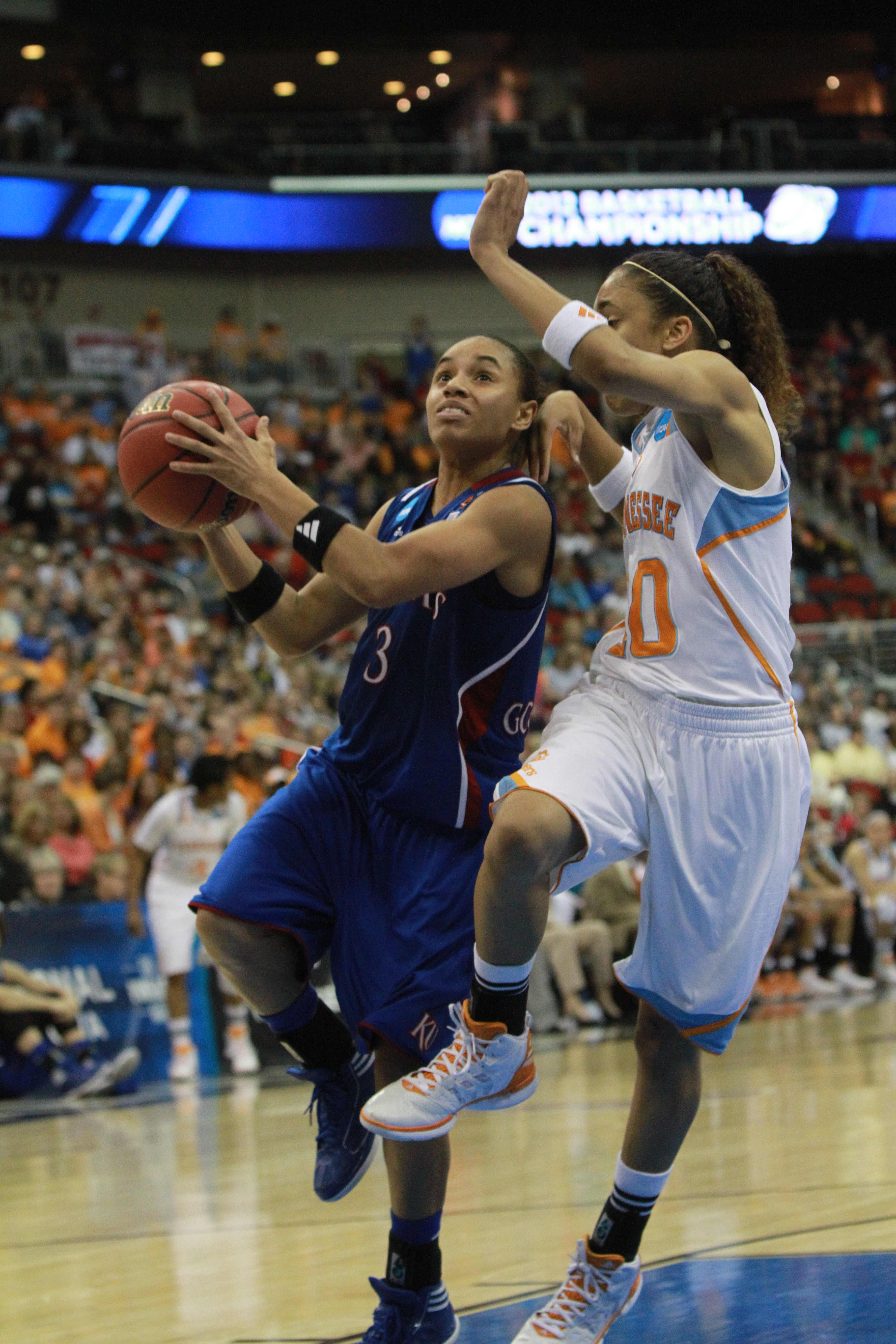 Kansas guard Angel Goodrich goes to the bucket against Tennessee guard Meighan Simmons on Saturday March 24, 2012 in Wells Fargo Arena in Des Moines, Iowa.