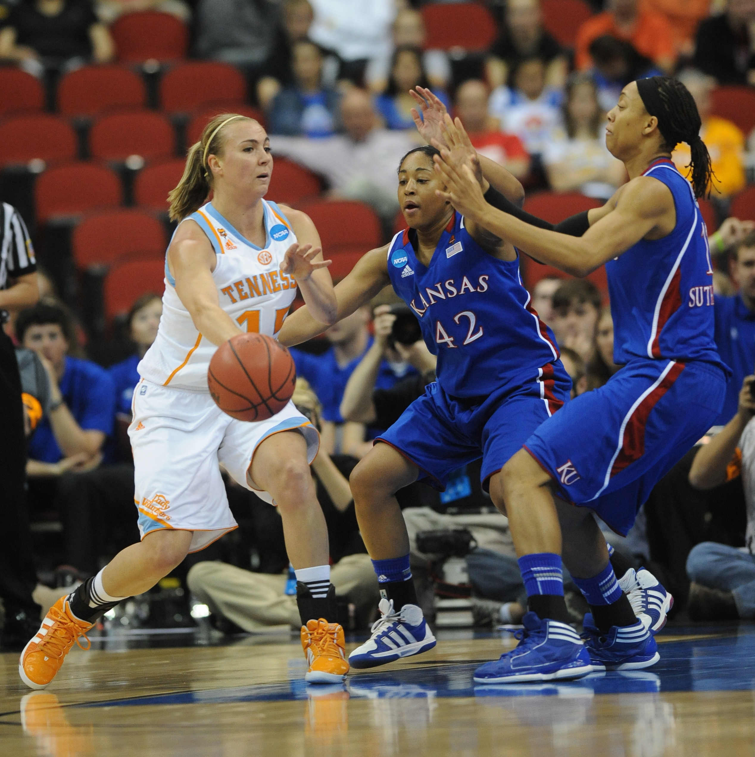 Tennessee forward Alicia Manning drives against Kansas defenders Natalie Knight (42) and Aishah Sutherland (11) in the first half on Saturday March 24, 2012 in Wells Fargo Arena in Des Moines, Iowa.