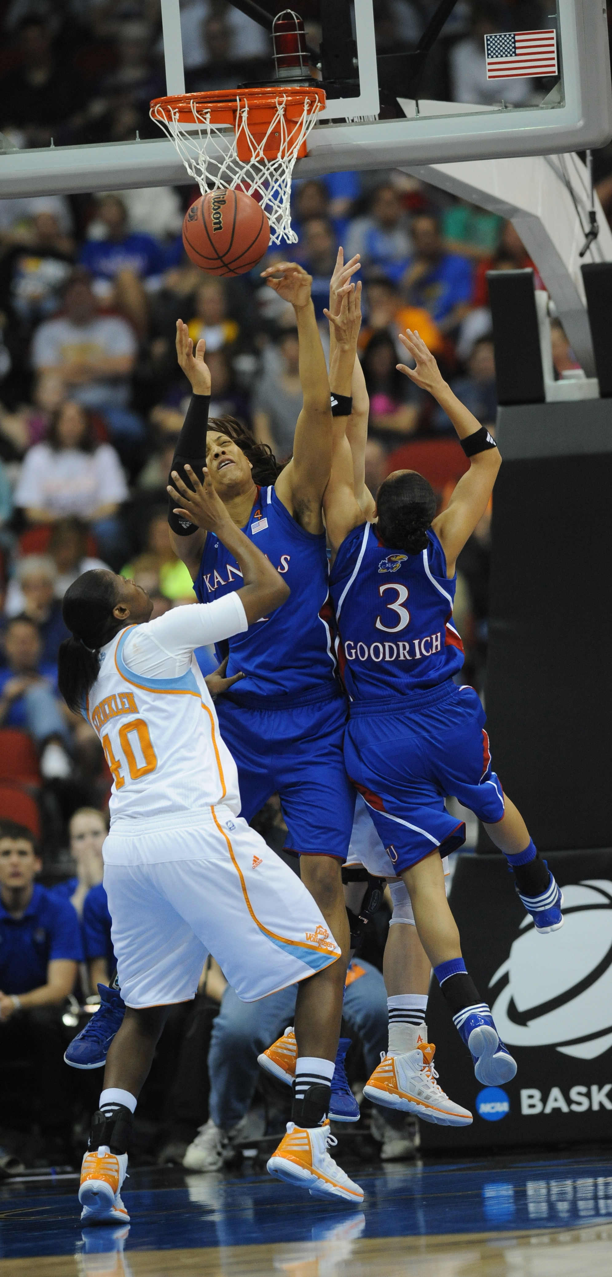 Kansas forward Aishah Sutherland and Angel Goodrich go for the rebound against Tennessee guard Meighan Simmons on Saturday March 24, 2012 in Wells Fargo Arena in Des Moines, Iowa.