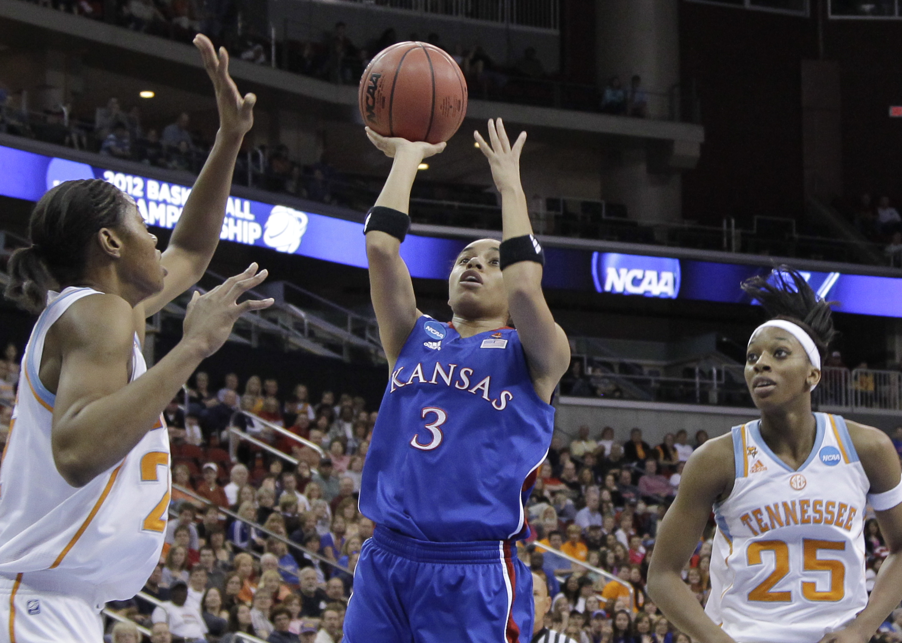 Kansas guard Angel Goodrich (3) shoots over Tennessee forward Vicki Baugh, left, and Glory Johnson in the first half of Saturday's game in Des Moines, Iowa.