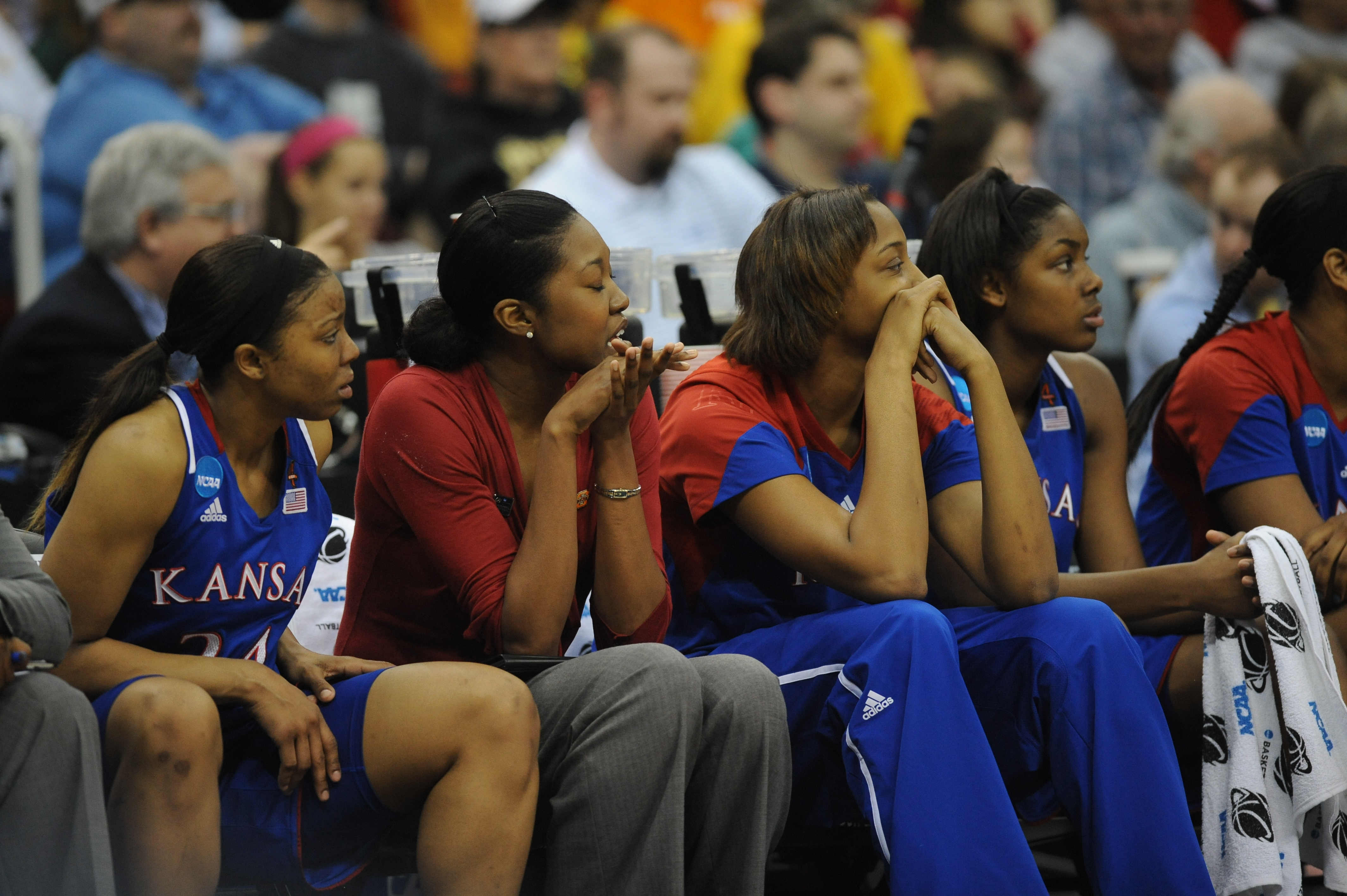 KU women watch from the sidelines during the final seconds of the Jayhawks 84-73 loss to Tennessee Saturday March 24, 2012, in Wells Fargo Arena in Des Moines, Iowa