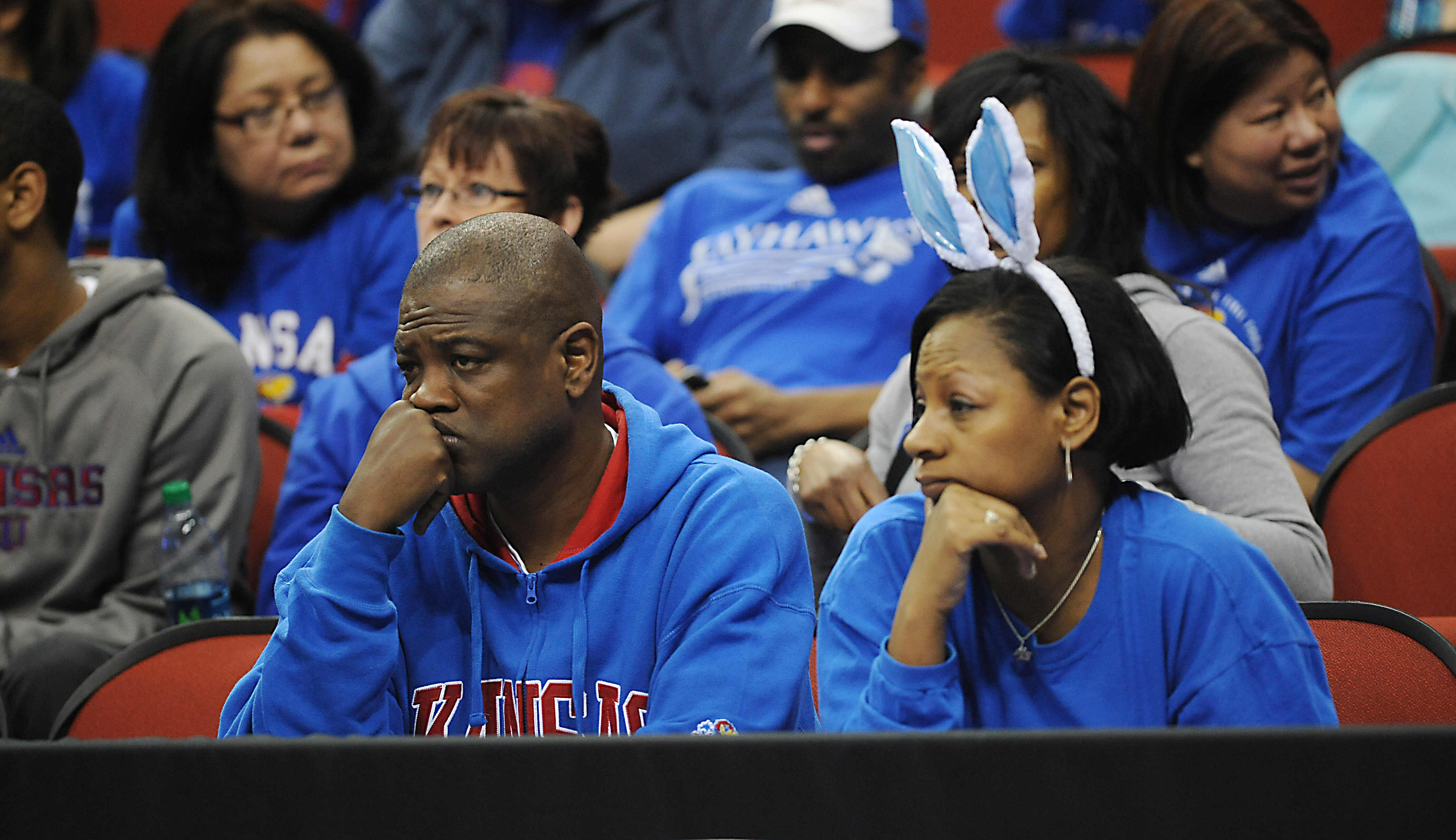 Shawn Williams and his wife Ton'nea Williams, parents of KU's #5 Bunny Williams, watch the final seconds of KU's 84-73 loss to Tennessee Saturday, March 24, 2012 in Wells Fargo Arena in Des Moines, Iowa.