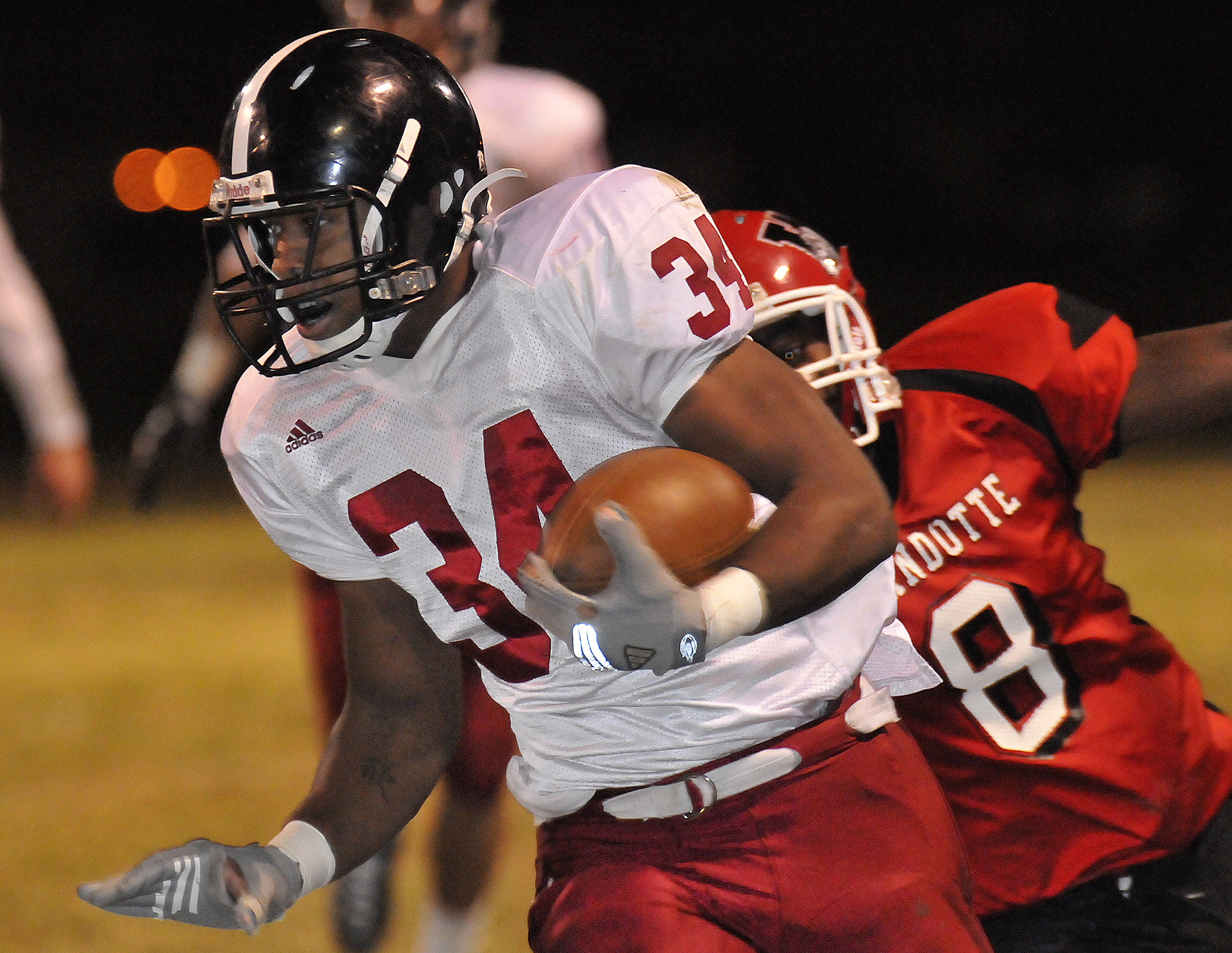 Lawrence High's Tyrone Jenkins (34) fights for extra yards in the first half against Wyandotte on Friday, Oct. 19, 2012, in Kansas City, Kan.