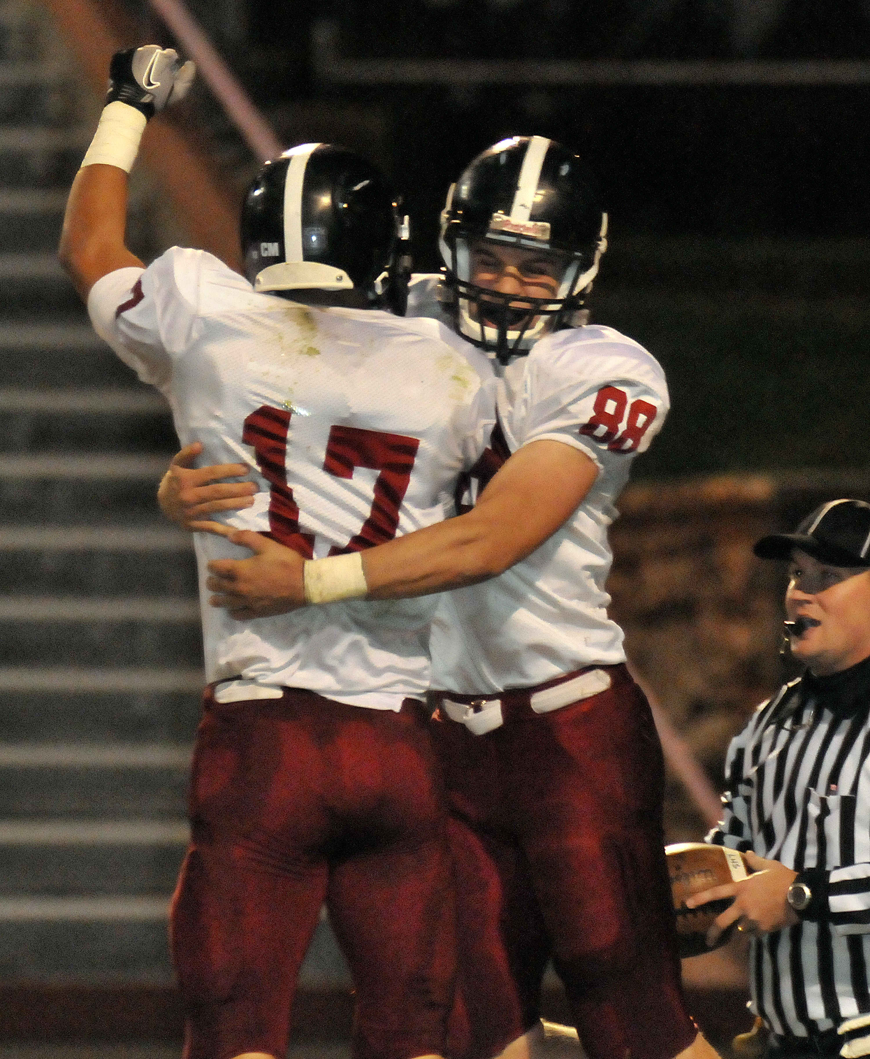 Lawrence High's Josh Seybert (88) celebrates his touchdown reception with teammate Drake Hofer (17) in the second quarter against Wyandotte on Friday, Oct. 19, 2012, in Kansas City, Kan.